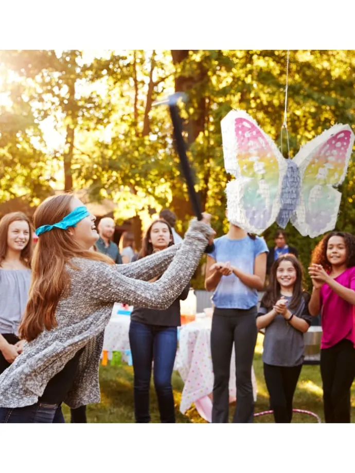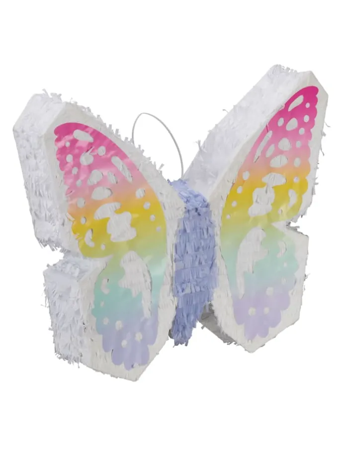 Mit dieser Schmetterling-Pinata sorgst Du im Handumdrehen für gute Stimmung auf dem nächsten Kindergeburtstag. Der niedliche Falter kann mit Süßigkeiten, Spielzeug, kleinen Geschenken oder Konfetti befüllt werden. Die Kinder schlagen dann abwechselnd mit verbundenen Augen mit einem Stock auf die Pinata ein, bis sie aufplatzt und die Überraschungen herausfallen. Je höher die Pinata gehangen wird, umso größer ist der Schwierigkeitsgrad.