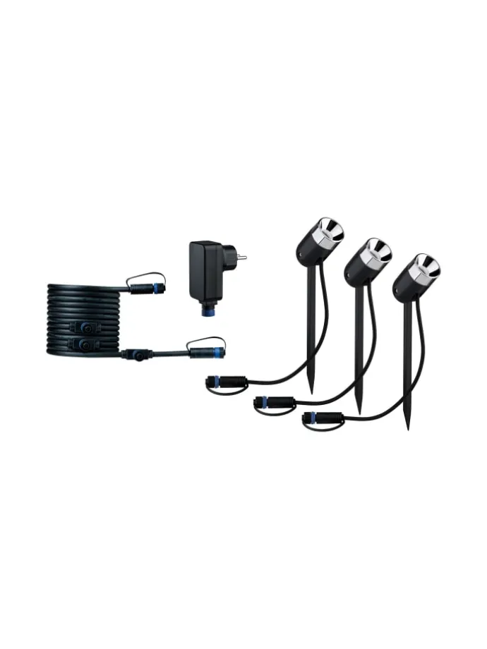 – Plug & Shine Basisset bestehend aus 3 Leuchten, 5 Meter Kabel mit 4 Ausgängen und Trafo