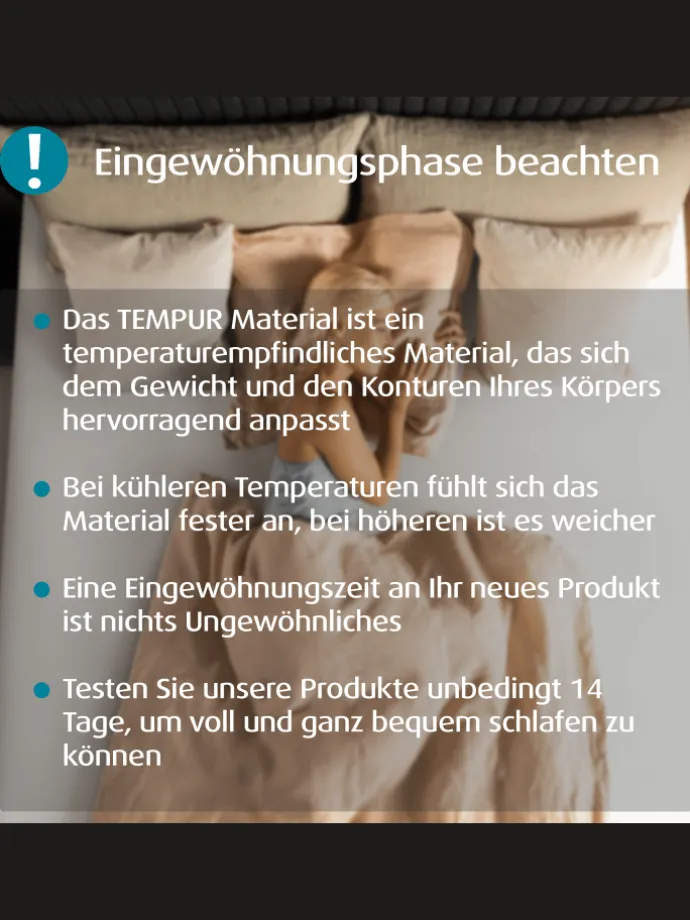 // Eingewöhnungszeit: Das TEMPUR Material reagiert auf Körper- sowie Raumtemperatur und passt sich langsam individuell Ihren Bedürfnissen an und verspricht ein bequemes Liegegefühl