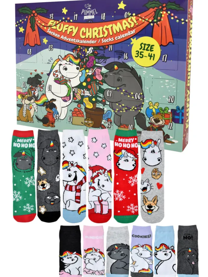 Pummel & Friends Pummeleinhorn Adventskalender mit 12 Paar Socken Größe 35-41 für Damen Weihnachtskalender mit Sneakers und langen Socken