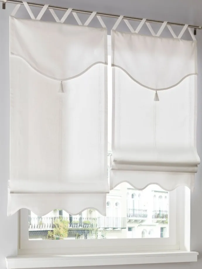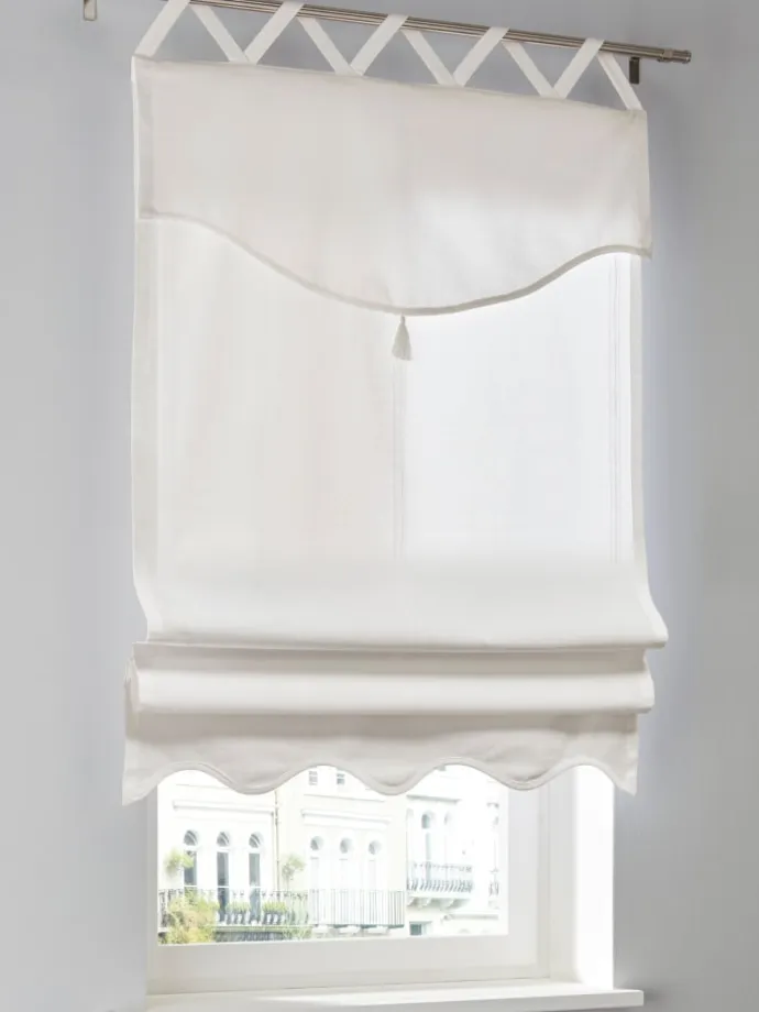 Raffrollo Blickdichte Qualität. Mit dekorativen Kreuzschlaufen zur Aufhängung an der Gardinenstange. Latz mit fixierter Quaste und gewelltem Abschluss. Beschwerungsstange oben und unten. Tipps zum richtigen Maßnehmen online. Unterstützt die Initiative Cotton made in Africa.