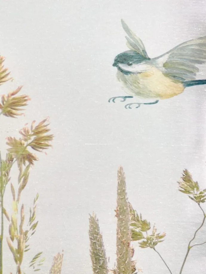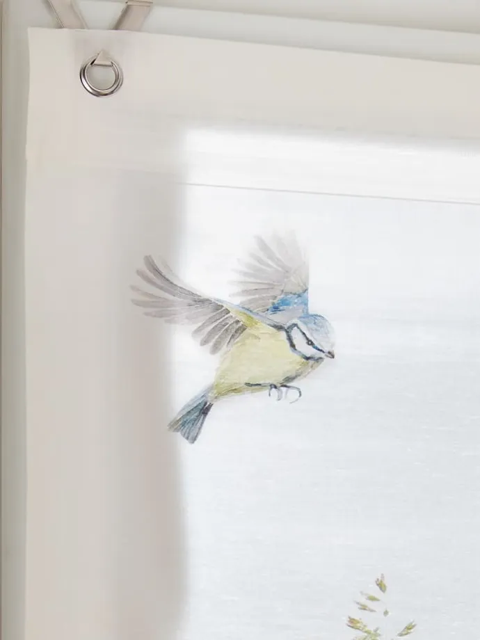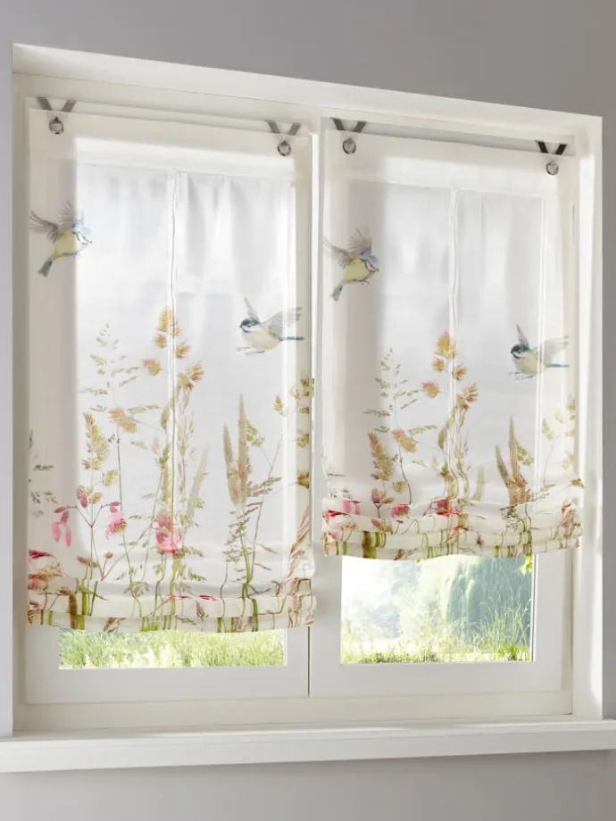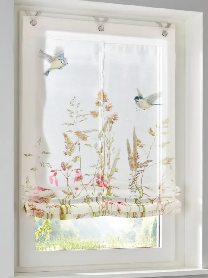 Raffrollo Halbtransparent, mit digital gedrucktem Blumen- und Vogel-Dessin. Ohne Bohren und Schrauben. Oben Blende mit Dreiecksösen. Gr. 1+2 mit 2 Ösen, Gr. 3, 4+5 mit 3 Ösen. Tipps zum richtigen Maßnehmen online. Haken bitte separat bestellen.