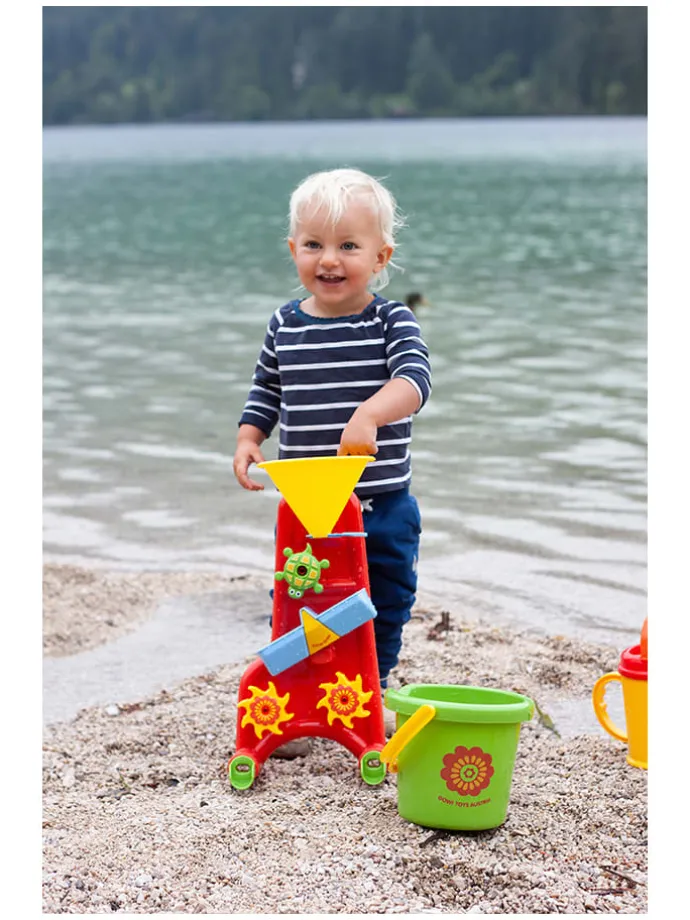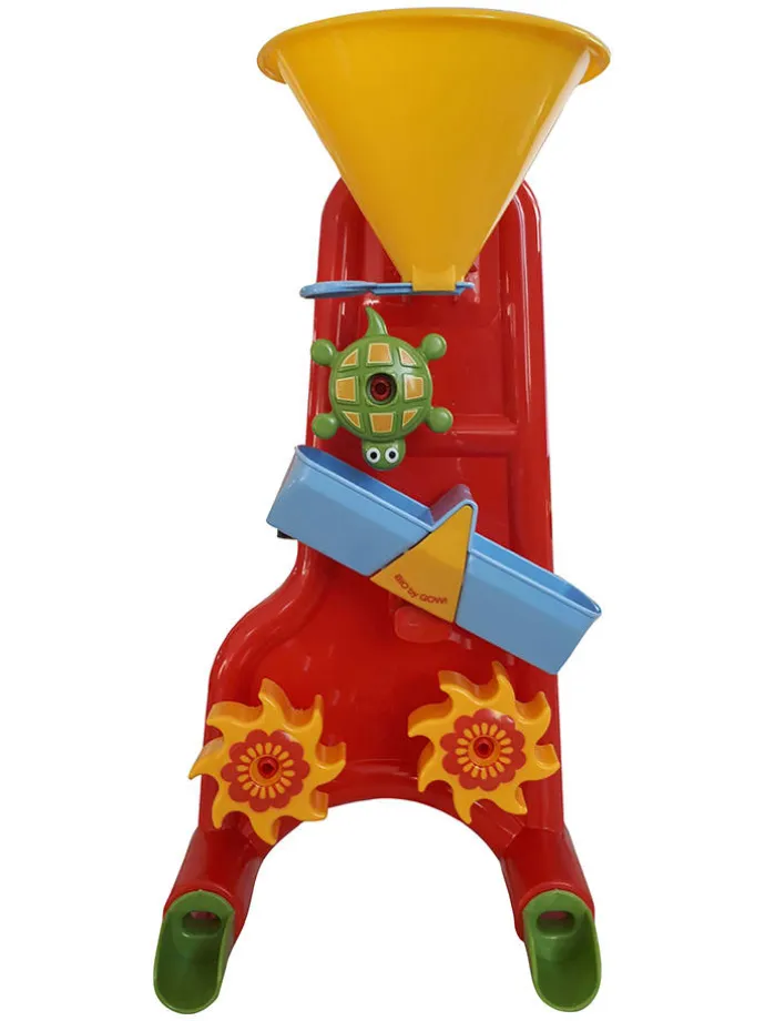 – Dder Inhalt fließt durch ein Schildkrötenrad, eine Wippe und zum Schluss durch zwei Sonnenräder, bis er am Boden angelangt ist