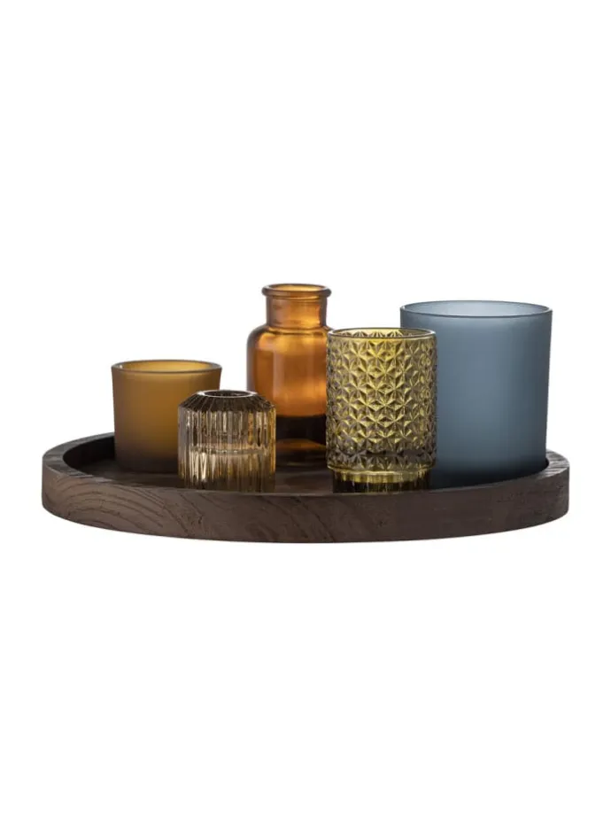 Sanga Kerzen-Tablett mit Teelichthaltern, Braun, Glas von Bloomingville aus Dänemark. Das Tablett Sanga mit Teelichthaltern von Bloomingville ist eine wunderschöne und elegante Dekoration. Erhältlich als rundes Tablett aus dunklem Paulownia-Holz mit fünf Glasteelichthaltern, die Sie als Deko nutzen können.