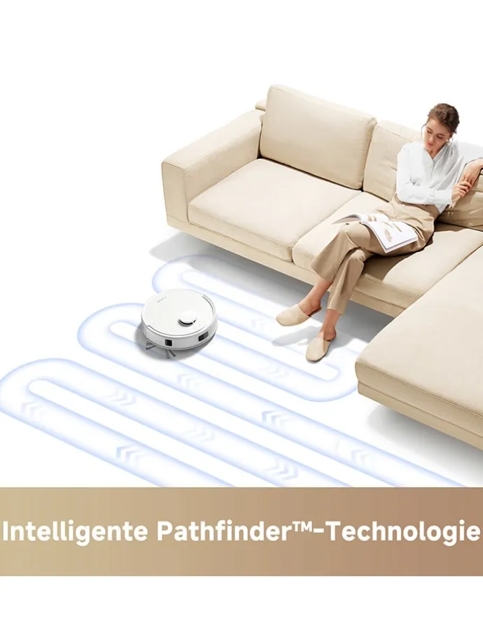 – präzise Navigation mit LDS-Laser (LiDAR): kartografiert Räumlichkeiten exakt und schafft effiziente Reinigungsrouten