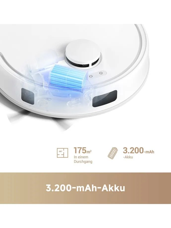 – präzise Navigation mit LDS-Laser (LiDAR): kartografiert Räumlichkeiten exakt und schafft effiziente Reinigungsrouten