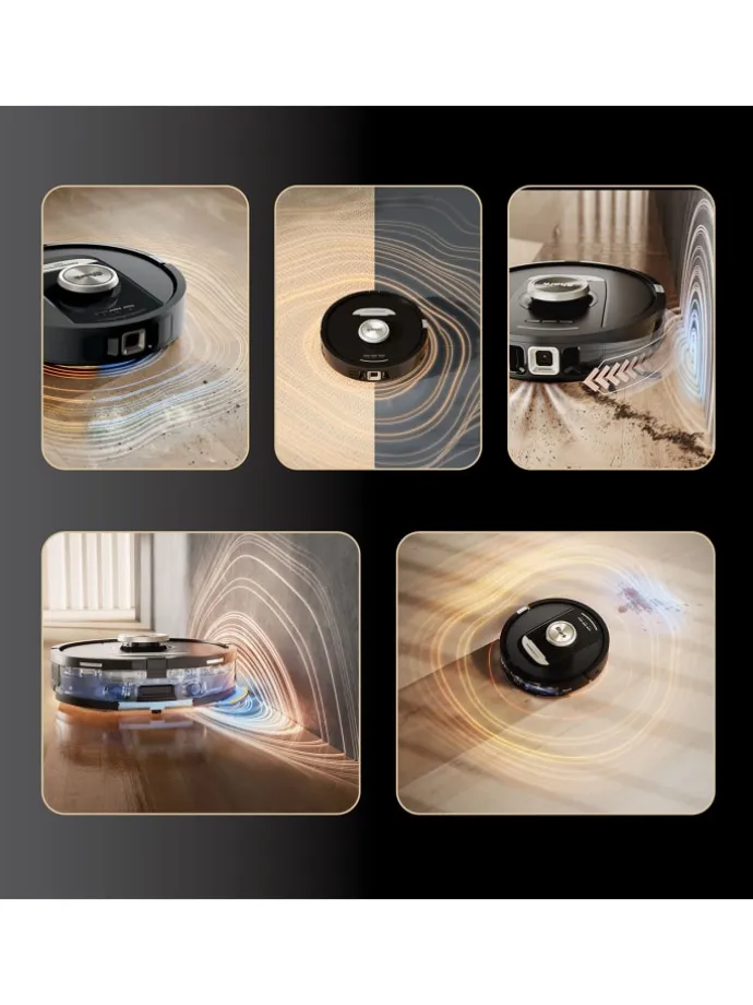 Genießen Sie im Saugmodus eine 50 % bessere Schmutzaufnahme und Kantenreinigung, da der Roboter versteckten Schmutz automatisch erkennt, Schmutz mit Luftstößen von den Kanten beseitigt und die Saugleistung automatisch an jeden Bodentyp anpasst.