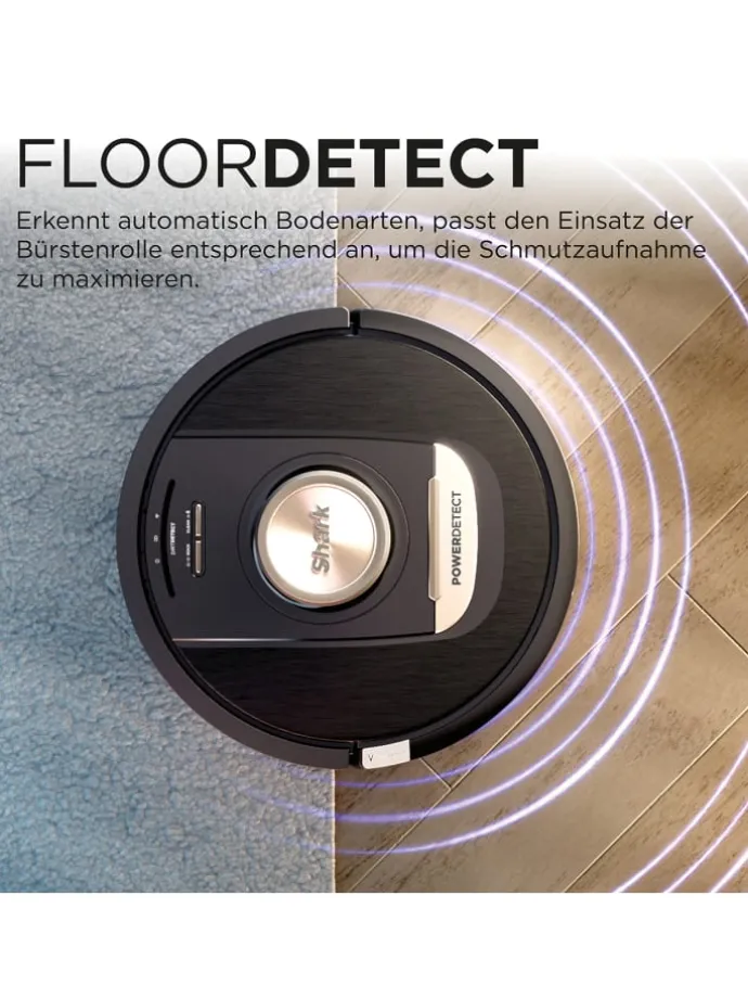 Der Shark PowerDetect selbstentleerende Saugroboter ist mit drei Tiefenreinigungs-Technologien ausgestattet, die die Leistung maximieren, indem sie den Schmutz, die Bodenart, Kanten und Ecken erkennen.