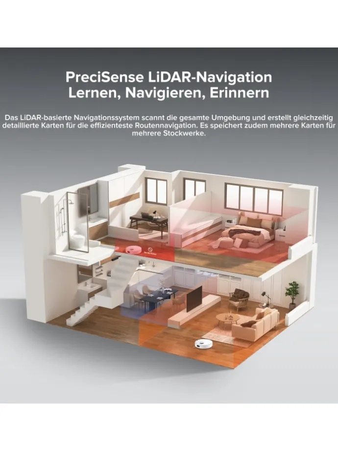PreciSense® LiDAR Navigation: Der hochpräzise Laserscanner erstellt detaillierte Karten Ihrer Wohnung und speichert mehrere Stockwerkspläne. Die intelligente Software schlägt automatisch optimale Reinigungsrouten und Sperrzonen vor.