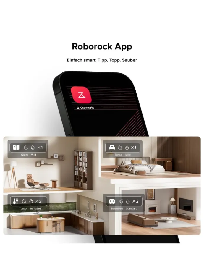 Roborock App & Sprachsteuerung durch Drittanbieter:Der Staubsaugerroboter bietet anpassbare Reinigung für jeden Raum und Boden über die Roborock App, mit der du mühelos die komplette Kontrolle übernimmst. Dank der temporären Reinigungsfunktion wirst du schnell mit Schmutz fertig, während die am Boden ausgerichtete Navigation effiziente Abdeckung in engen Räumen sicherstellt. Profitiere von müheloser, präziser Reinigung, die sich an deinen Lebensstil anpasst.