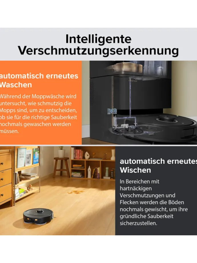 Rotierende Mops : Einfache Fleckenentfernung dank einer Geschwindigkeit* von 200 U/min und konstantem hohen Anpressdruck. Hebt die Mops bis zu 10 mm an, wenn ein Teppich erkannt wird. So bleiben Ihre Teppiche trocken und Sie müssen sich keine Sorgen um die Reinigung machen. Extreme Saugleistung von 7.000 Pa – Die HyperForce-Saugleistung wurde auf 7000 Pa erhöht. Dadurch kann Ihr Saugroboter noch tiefere Rückstände und Staubpartikel aufnehmen und sowohl von Hartböden als auch von Teppichen aufsaugen.