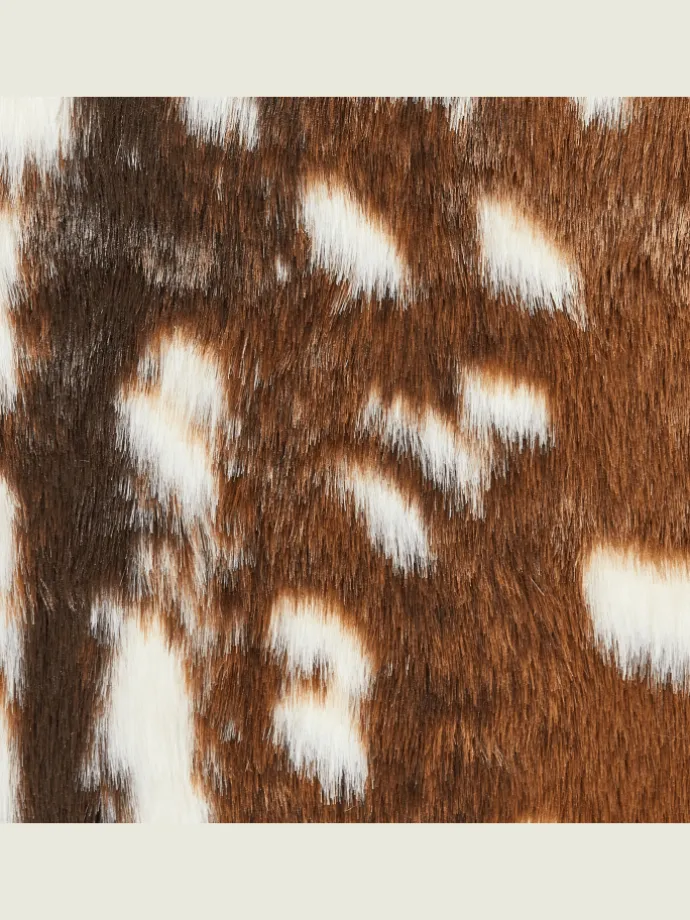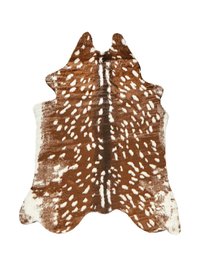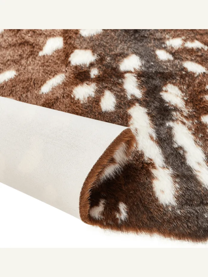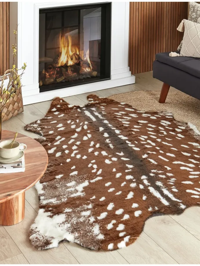 Kunstlederteppich mit Tiermuster. Ein dekorativer Kunstfellteppich ist eine hervorragende Wahl, um optische Wärme in Ihr Wohnzimmer zu bringen, sei es neben dem Sofa oder neben dem Bett im Schlafzimmer. Der weiche Flor des Teppichs sorgt für einen angenehmen Fußkomfort, während das markante Muster ein charmantes, rustikales Ambiente schafft. Außerdem ist der Teppich mit einer rutschfesten Unterseite ausgestattet.