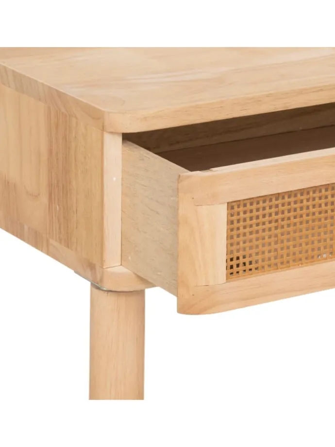 Natürliche Farbe und schlichtes Design: Der Schminktisch und der Hocker haben eine hellbraune Farbe. Die Schubladenfront aus Rattan verleiht Charme und Leichtigkeit. Auf dem Schminktisch ist ein Spiegel angebracht, der dem Kind hilft, Charisma zu üben.