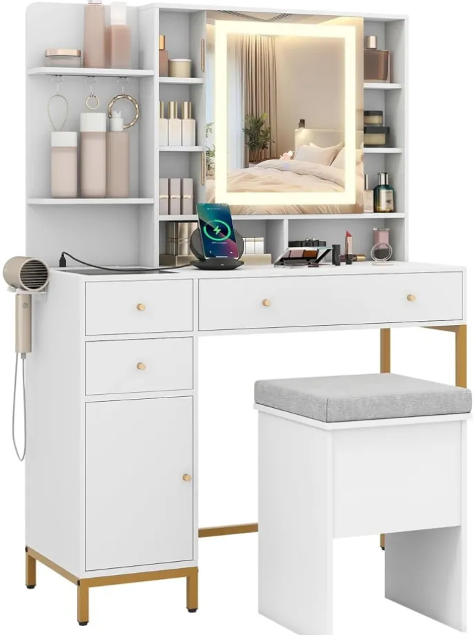 Verbessern Sie Ihre tägliche Routine mit diesem Frisiertisch-Set. Dieser Schminktisch verfügt über eine eingebaute Ladestation zum bequemen Aufladen von Geräten. Der HD-LED-beleuchtete Spiegel bietet einstellbare Helligkeit und 3 Farboptionen für Ihre Bedürfnisse. Sie können mit reichlich Stauraum einschließlich eines Spiegelschranks, Schubladen, mehreren offenen Regalen und mehr organisiert bleiben. Dieses stilvolle und praktische Schminktisch-Set ist perfekt für Ihre Lieben zu besonderen Anlässen und vereint Funktionalität und Eleganz auf wunderschöne Weise.