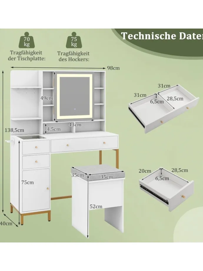 Maße des Frisiertisches: 98 cm x 40 cm x 138,5 cm (L x B x H)