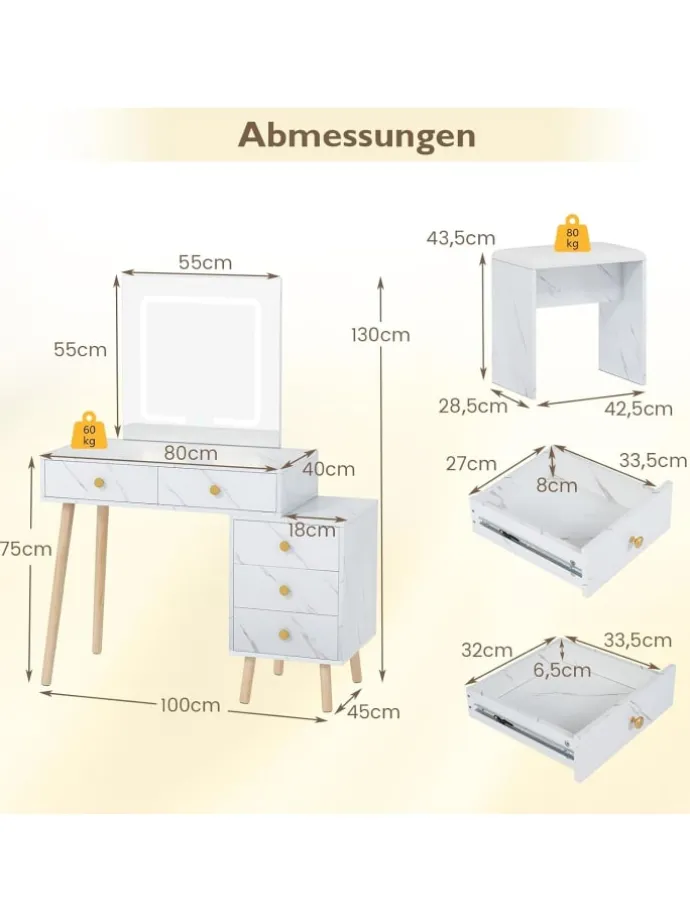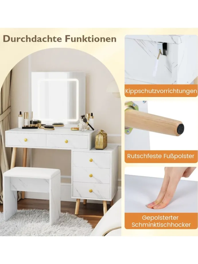 Kreieren Sie ein atemberaubendes und praktisches Schminkset, das sich Ihrem Lifestyle anpasst! Der quadratische LED-Spiegel bietet 3 Lichtfarben und eine einstellbare Helligkeit, damit Ihr Make-up sowohl tagsüber als auch nachts makellos gelingt. Mit 2 Hauptschubladen, 3 Seitenschubladen und einem vielseitigen Seitentisch haben Sie vielfältige Aufbewahrungsmöglichkeiten – perfekt zur Organisation oder als eleganter Nachttisch.