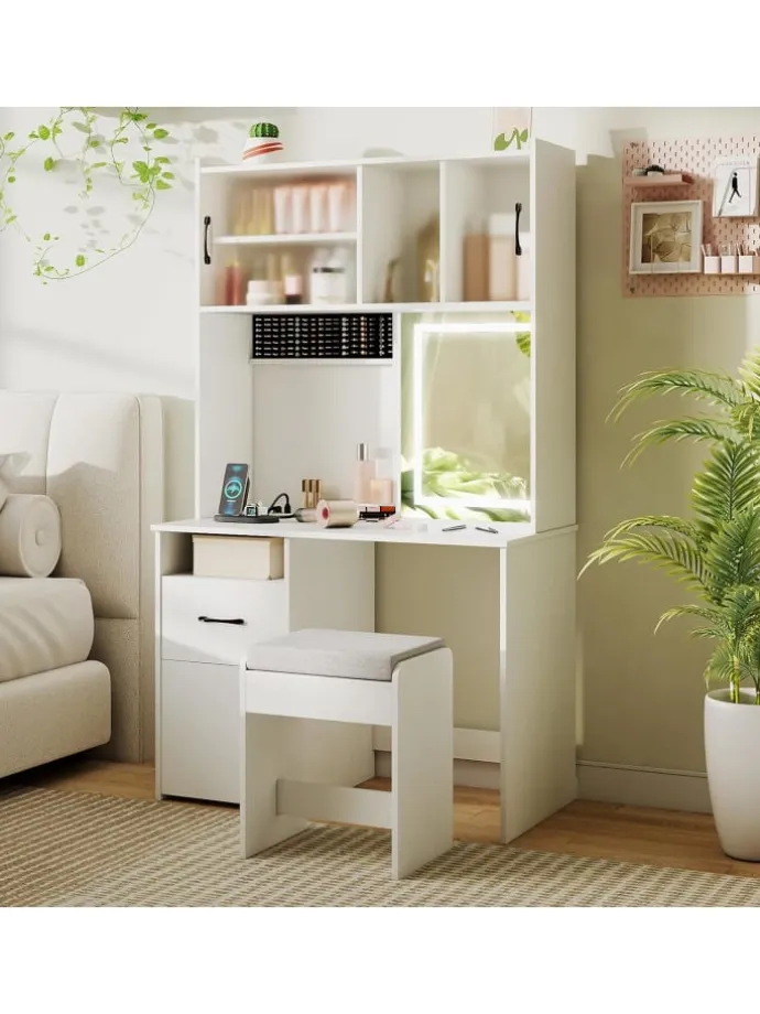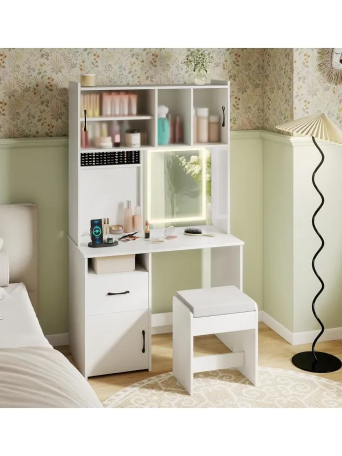 Der Spiegel bietet 3 Farbmodi und eine stufenlos einstellbare Helligkeit. Die integrierte Ladestation erleichtert das Aufladen von Telefon, Tablet oder Stylinggeräten während des Schminkens. Viel Stauraum umfasst ein oberes Ablagefach, einen Schiebetürschrank, Ringhalter, ein offenes Fach, eine Schublade und einen Seitenschrank für eine mühelose Organisation von Make-up und Accessoires. Für Sicherheit und Langlebigkeit sorgt die Ausstattung mit Kippschutzvorrichtungen sowie ein gepolsterter Sitz für mehr Komfort. Das moderne, elegante Design fügt sich harmonisch in verschiedene Einrichtungsstile ein und verleiht Ihrem Raum Funktionalität und Stil.