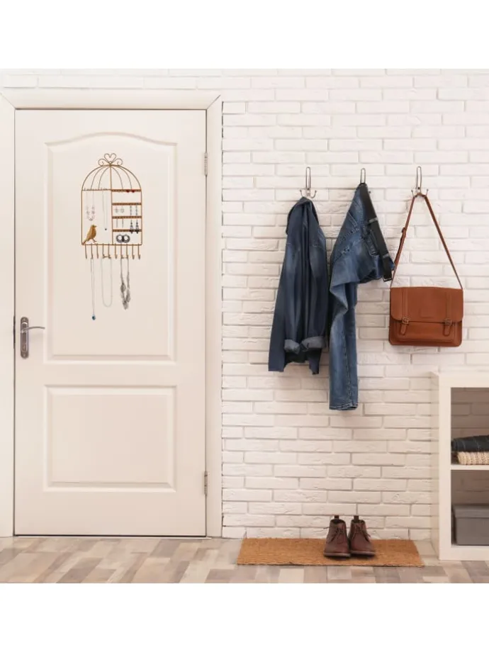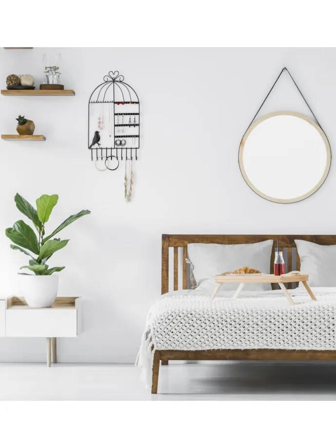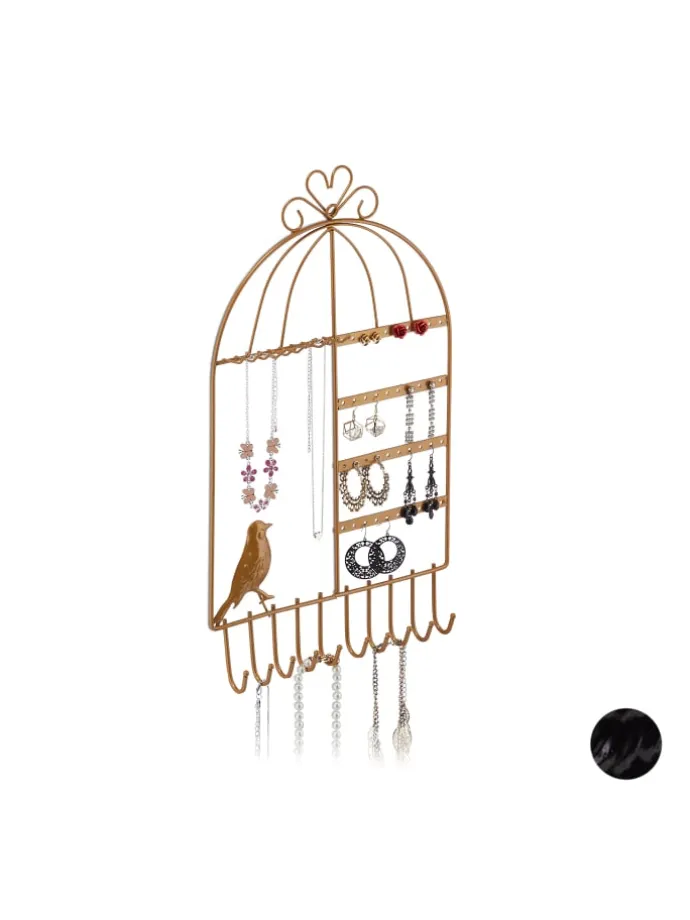 Mit diesem Schmuckhalter bewahren Sie Ihren Schmuck übersichtlich und geordnet auf. Der Schmuckorganizer bietet Platz für Ohrringe und -stecker, Armbänder, Uhren und Halsketten. Da die Schmuckleiste an die Wand montiert wird, lassen sich auch lange Halsketten problemlos aufhängen und sind vor Verheddern geschützt. Dank des romantischen Vogelkäfig-Designs ist der Ohrringhalter zudem ein echter Hingucker und eine stylische Präsentationsmöglichkeit für Ihren Lieblingsschmuck.