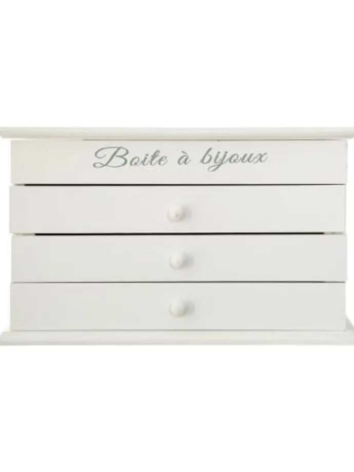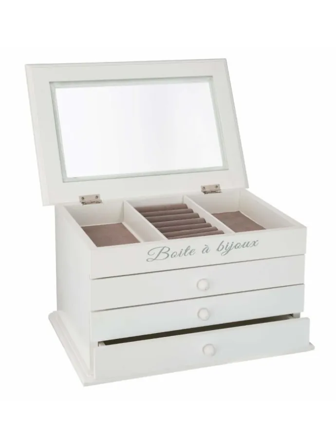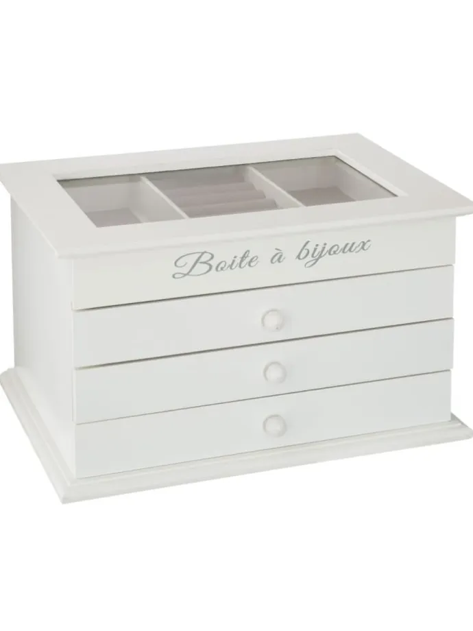 Der Schminktisch für Frauen kann ohne eine geeignete Schmuckschatulle und geliebte Schmuckstücke nicht existieren. Darin können Sie all Ihre Schmuckstücke sowie kleine Geheimnisse aussortieren. Drei geräumige Schubladen für angemessen verteilte Ketten, Uhren und Ketten, die sich nie wieder verheddern werden. Über ihnen ist eine zarte, stilvolle Dekoration. Die Oberseite der Box ist eine horizontale Vitrine, die in drei gleiche Abschnitte unterteilt ist – Sie können Ohrringe, Anhänger, Ringe oder was Sie besonders gerne aufbewahren, da der Deckel teilweise aus Glas besteht. Diese Kassette wird sicherlich jeder Frau von einem kleinen Mädchen bis zu einer reifen Dame gefallen. Auf wundersame Weise wird es auf einem Schminktisch oder auf einer Kommode im Schlafzimmer präsentiert. Es ergänzt Ihr Interieur mit einem femininen Accessoire und hilft Ihnen, Ihre Schätze sicher zu verstauen.