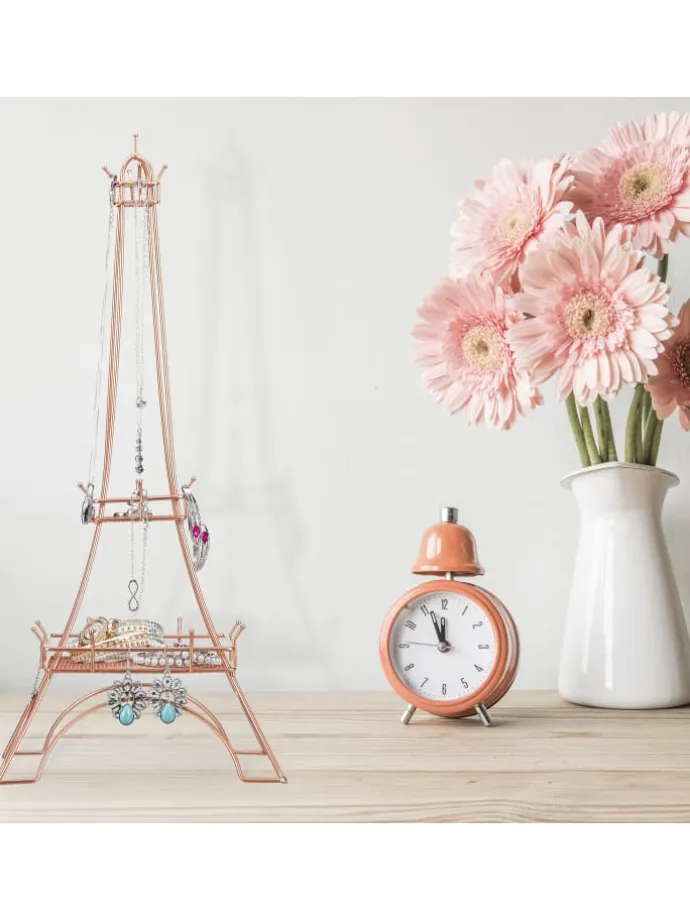Mit diesem Schmuckaufhänger gehören verhedderte Halsketten der Vergangenheit an. Der Schmuckständer aus Metall bietet auf 17 Haken Platz für unterschiedlich lange Ketten. Aber auch Ringe, Armreifen und Uhren lassen sich übersichtlich auf den 2 Ablagen der Schmuckhalterung verstauen. Dank der außergewöhnlichem Optik in Form des Pariser Eiffelturmes, ist der Kettenbaum das ideale Wohnaccessoire für alle Frankreich-Fans.