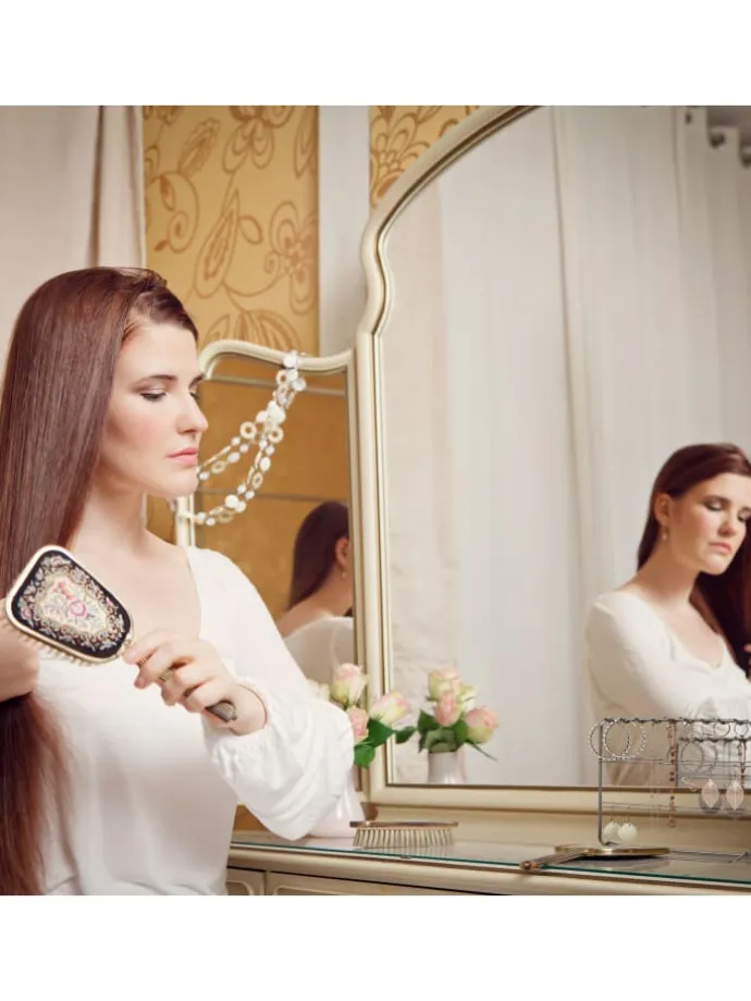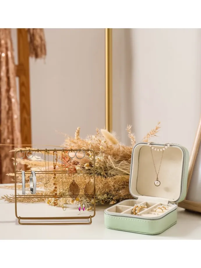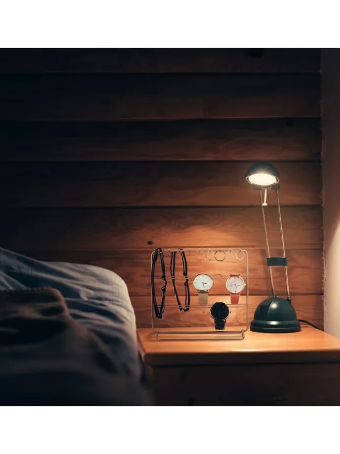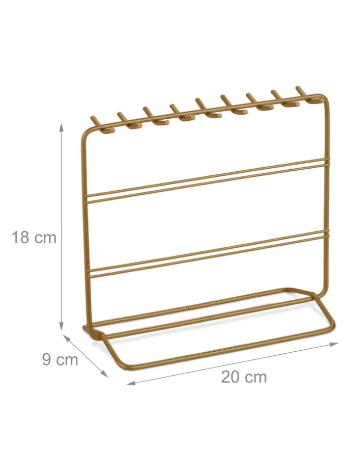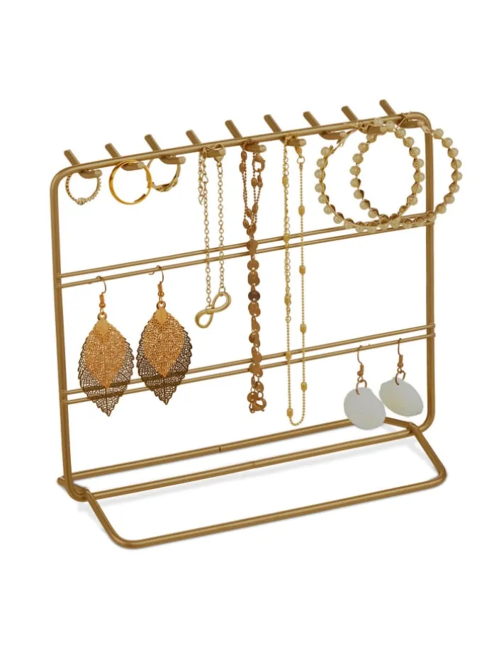 Die Schublade ist voller Schmuck, die Ketten sind verheddert und Du kannst Deine Lieblingsohrringe nicht finden? Dann ist dieser Schmuckständer die Lösung! Auf 18 Haken ist Platz für Ketten, Ringe und Armbänder. Die 4 Querstangen sind ideal für die Aufbewahrung von Ohrringen und Armbändern mit Verschluss. Doch auch Uhren sind gut auf dem Schmuckhalter aufbewahrt. Zudem ist der Ohrringhalter ein edler Blickfang auf Deinem Schminktisch oder der Kommode im Schlafzimmer.