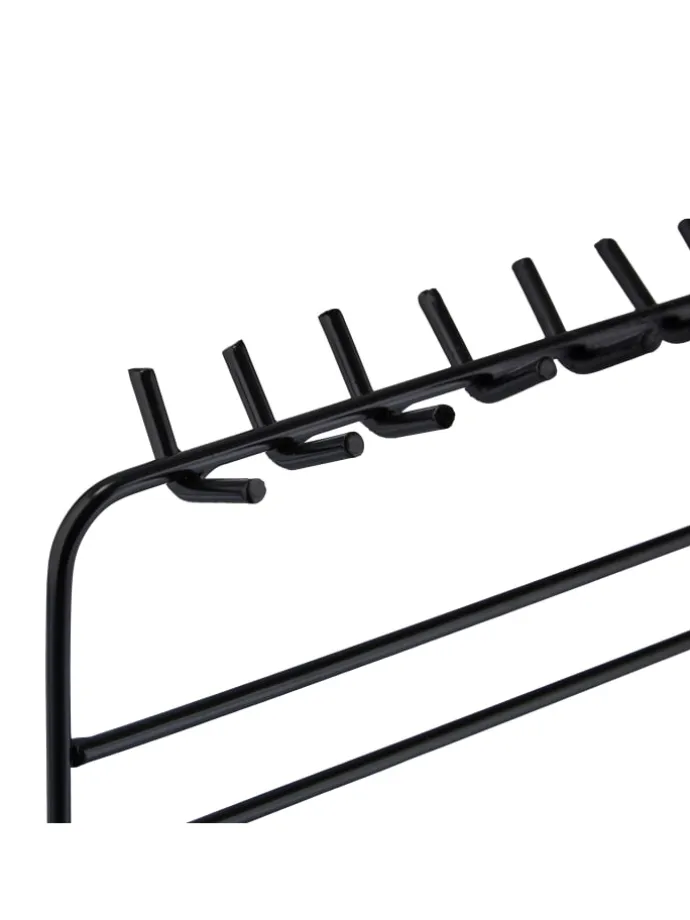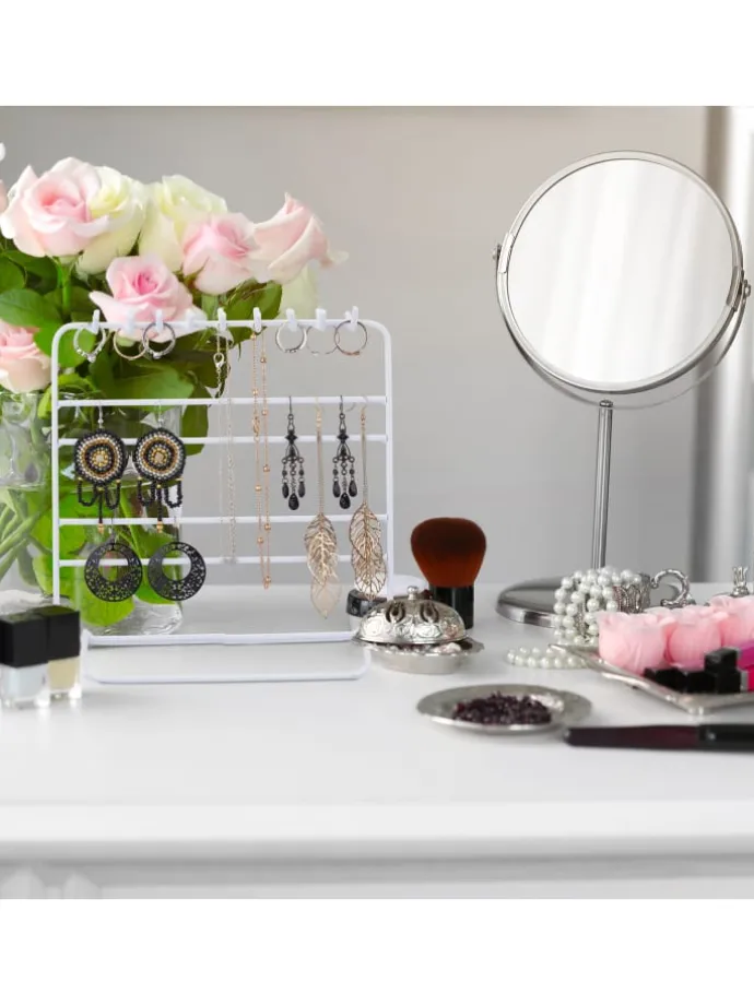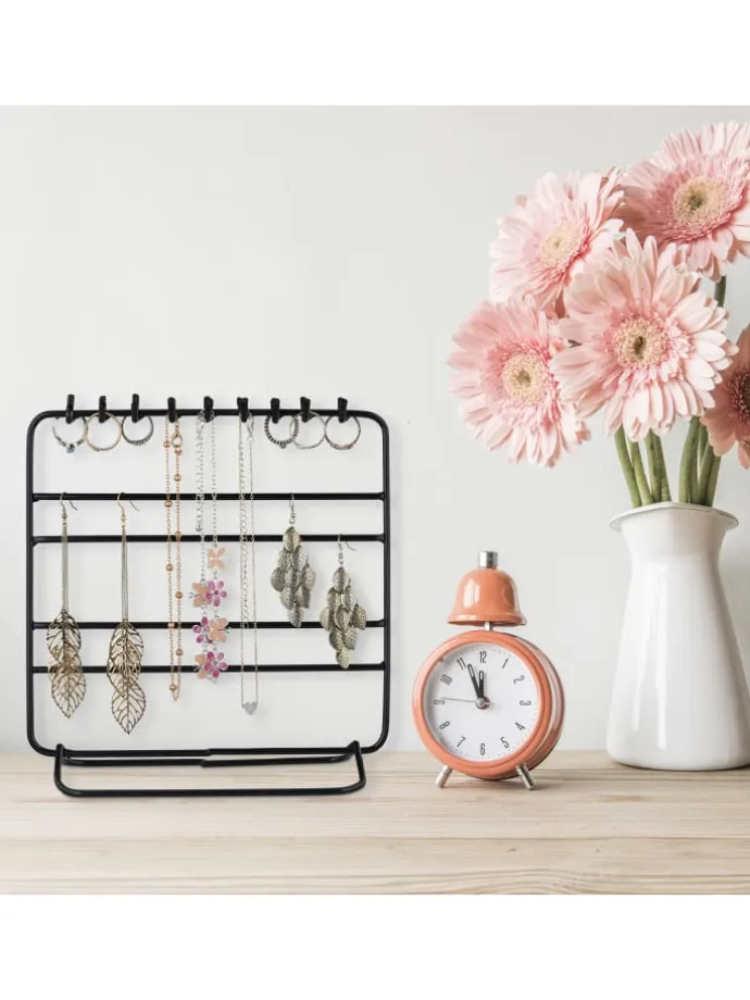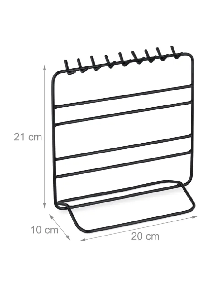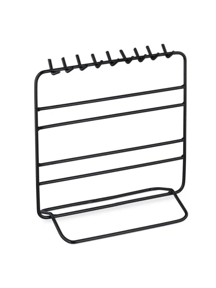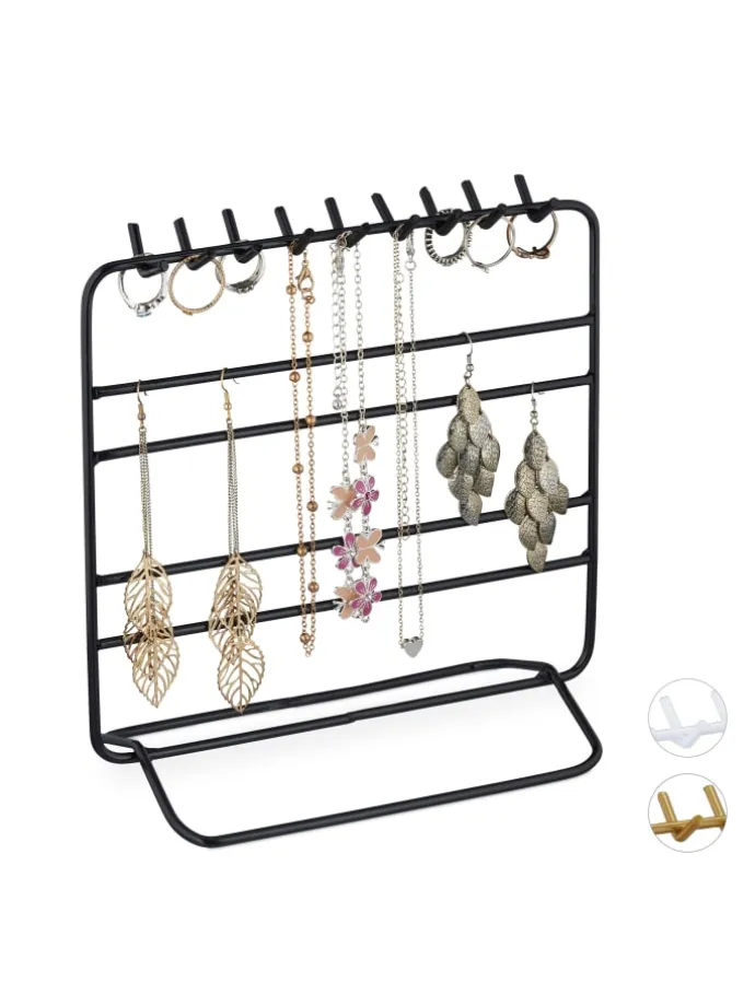 Im Bad liegt alles voller Schmuck, die Ketten sind verheddert und Sie können Ihre Lieblingsohrringe nicht finden? Dieser Schmuckständer ist die Lösung! Auf 18 Haken ist Platz für Ihre Ketten, Ringe und Armbänder und die 4 Querstangen sind ideal für die Aufbewahrung von Ohrhängern und Armbändern mit Verschluss. Doch auch Uhren oder Sonnenbrillen sind gut auf dem Schmuckhalter aufbewahrt. Durch das schlichte Design steht Ihr Schmuck im Mittelpunkt und der Kettenständer passt in jede Einrichtung.