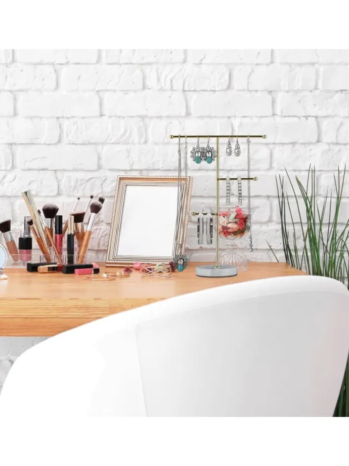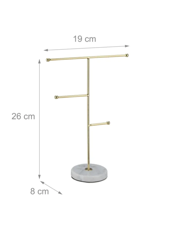 Mit diesem Schmuckhalter gehören verhedderte Halsketten der Vergangenheit an. Der Schmuckständer bietet auf drei Stangen Platz für unterschiedlich lange Ketten. Aber auch Ohrringe, Armbänder und -reifen lassen sich übersichtlich auf der Schmuckhalterung verstauen. Dank der schlichten, eleganten Optik fügt sich der Kettenorganizer hervorragend auf jedem Schminktisch ein. Besonders edel wird der Schmuckbaum durch den Sockel aus massivem weißem Marmor und den Gold glänzenden Stangen.