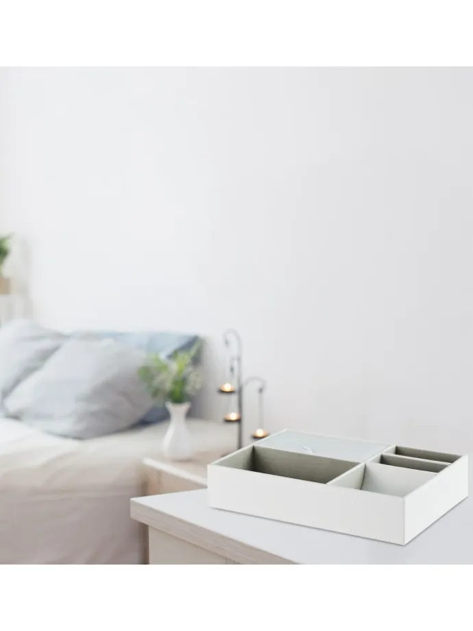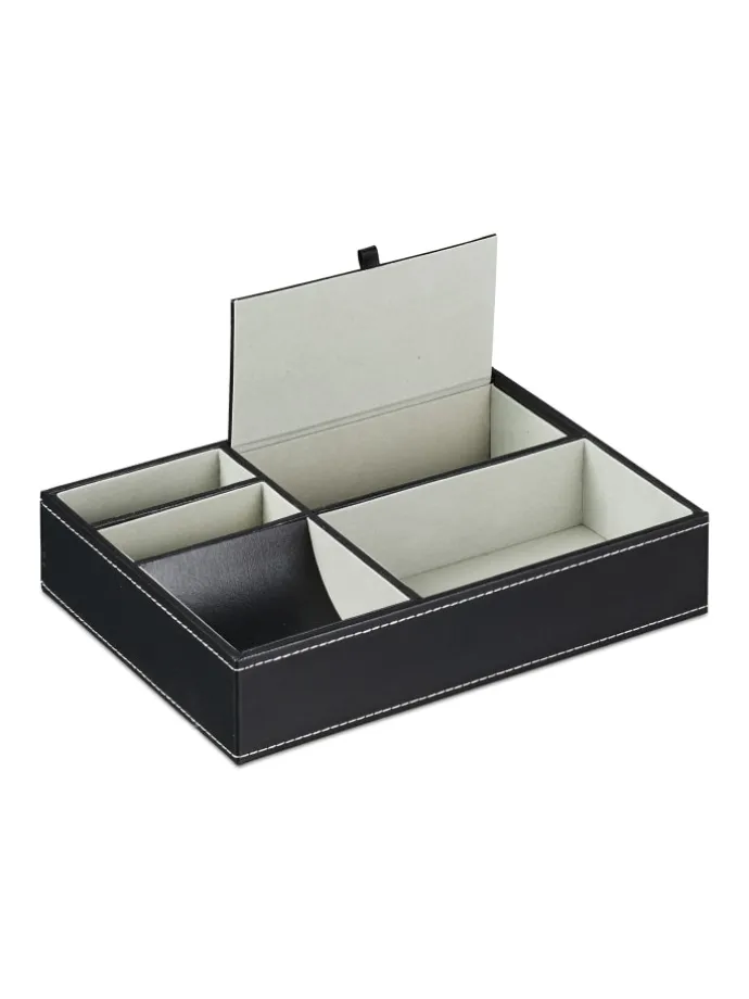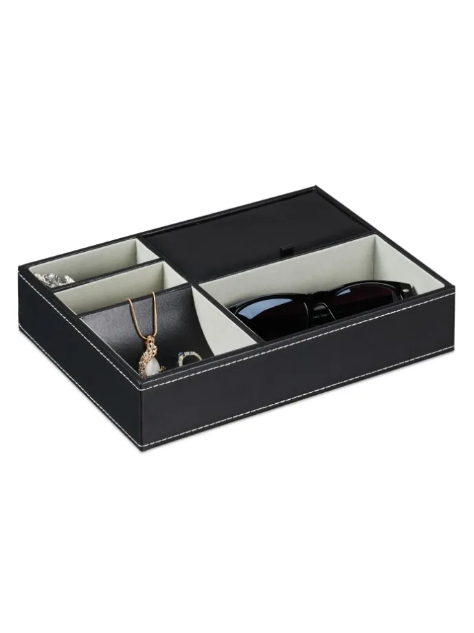 Mit diesem Schmuck-Organizer bewahrst Du Deine liebsten Schmuckstücke geordnet und übersichtlich auf. Das offene Design von 4 Fächern ermöglicht Dir direkten Überblick und Zugriff, während das Fach mit Deckel Deinen Schmuck vor Staub schützt. Dabei findet alles von Ringen bis zu Manschettenknöpfen seinen Platz. Der weiche Bezug des Schmuckbretts bietet dabei Schutz vor Kratzern. Das elegante Design in Lederoptik und der graue Innenbezug machen den Schmuckeinsatz zu einem stilvollen Hingucker.