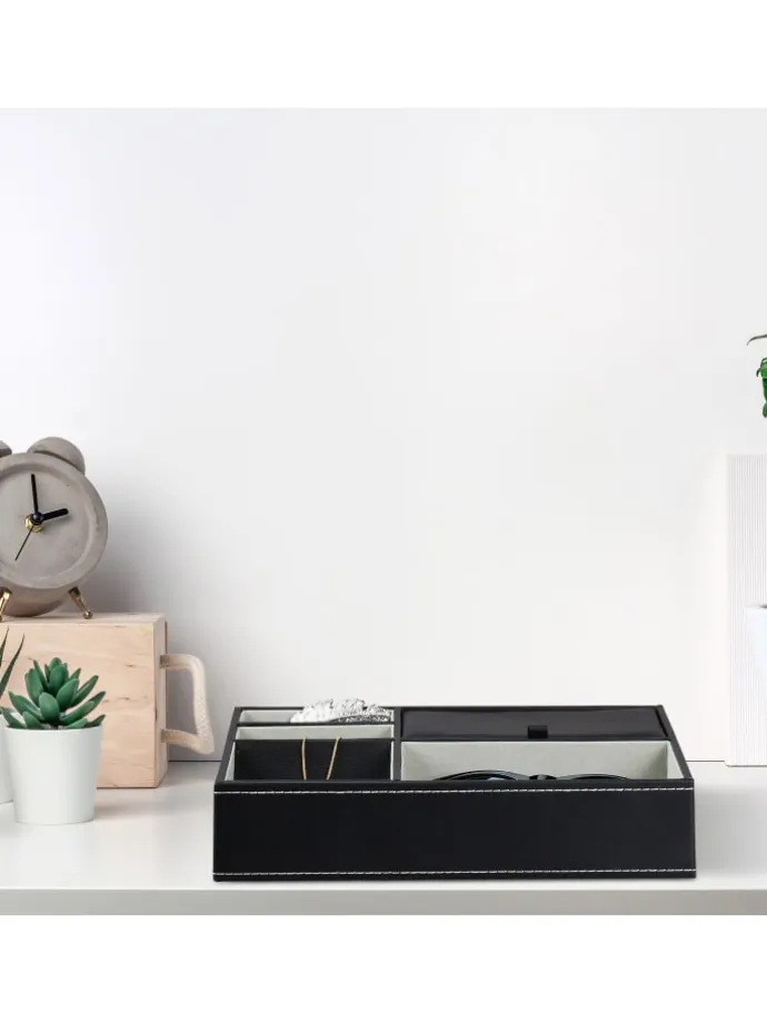 Mit diesem Schmuck-Organizer bewahrst Du Deine liebsten Schmuckstücke geordnet und übersichtlich auf. Das offene Design von 4 Fächern ermöglicht Dir direkten Überblick und Zugriff, während das Fach mit Deckel Deinen Schmuck vor Staub schützt. Dabei findet alles von Ringen bis zu Manschettenknöpfen seinen Platz. Der weiche Bezug des Schmuckbretts bietet dabei Schutz vor Kratzern. Das elegante Design in Lederoptik und der graue Innenbezug machen den Schmuckeinsatz zu einem stilvollen Hingucker.