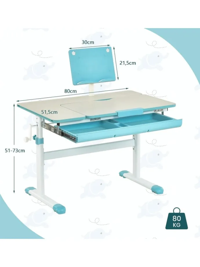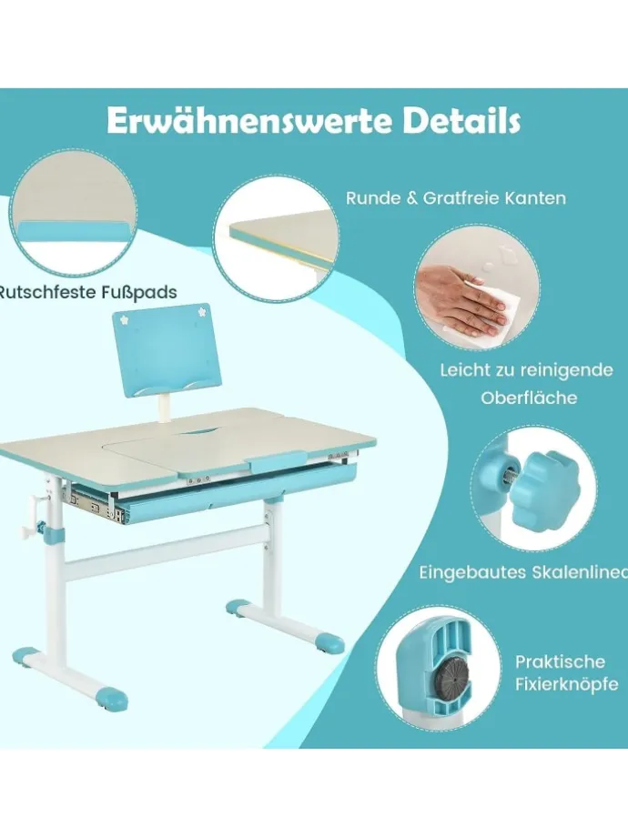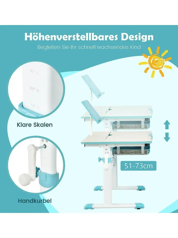 Dieser Kinderschreibtisch ist eine großartige Wahl für Kinder zum Lernen, Lesen oder Zeichnen. Dank der höhenverstellbaren Funktion kann dieser Schreibtisch mit Ihrem Kleinen mitwachsen. Und die verstellbare Tischplatte lässt sich in 7 Winkeln verstellen, sodass Kinder für verschiedene Zwecke die am besten geeignete Position finden können. Abgerundete Ecken schützen die empfindliche Kinderhaut. Der solide Metallrahmen und die rutschfesten Fußpolster sorgen dafür, dass er stabil bleibt und nicht leicht wackelt. Dieser Tisch ist ein ideales Geschenk für Ihr Kind zur Vorbereitung auf die Schulzeit.