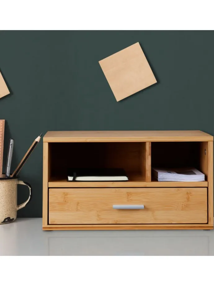 Dieser Bürotisch-Organizer sorgt für einen besseren Überblick auf Deinem Schreibtisch. Mit seinen 2 Fächern und der geräumigen Schublade bietet er viel Stauraum, um Schreibwaren oder Dokumente zu ordnen. Du kannst den Schreibtischbutler auch als Drucker-Organizer verwenden. Stelle einfach oben Deinen Drucker ab und nutze den Raum darunter sinnvoll für beispielsweise Ersatzpatronen. Die Schreibtischbox aus Bambus wirkt mit ihrer natürlichen Maserung sehr dekorativ im Büro oder Arbeitszimmer.