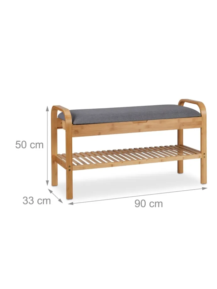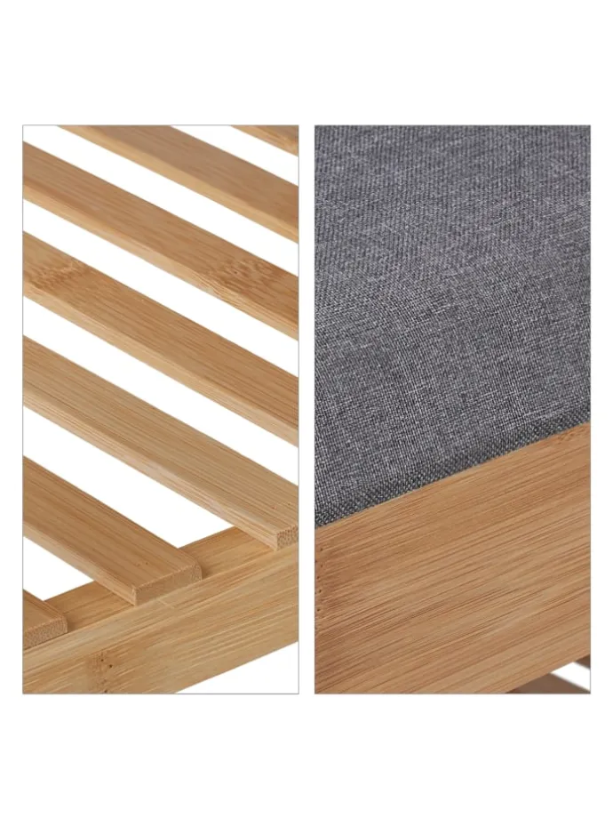 Dieses Schuhregal aus Bambus setzt natürliche Akzente in der Garderobe und bietet Platz für 4 Paar Deiner Lieblingsschuhe. Nach einem langen Tag kannst Du auf der gepolsterten Sitzfläche bequem aus den Schuhen schlüpfen. Dank des offenen Designs hast Du das passende Paar beim Zusammenstellen Deines Outfits jederzeit griffbereit. Zudem befindet sich unter dem Sitzpolster der Schuhbank ein praktisches Innenfach, in dem Tücher, Handschuhe oder auch Schuhpflege und -sohlen verstaut werden können.