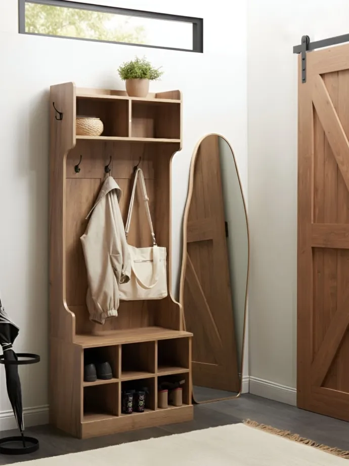 Garderobe mit offenen Schuhfächern und 4 Haken. Diese durchdachte Flurgarderobe sorgt dafür, dass Ihr Eingangsbereich stets ordentlich und einladend bleibt. Die warme Holzoptik kombiniert großzügigen Stauraum mit einem aufgeräumten, stilvollen Design. Zahlreiche Haken sowie Ablageflächen oben und unten bieten Platz für Mäntel, Taschen, Schuhe und andere Alltagsgegenstände. Eine praktische und gleichzeitig dekorative Ergänzung für jeden Flur.