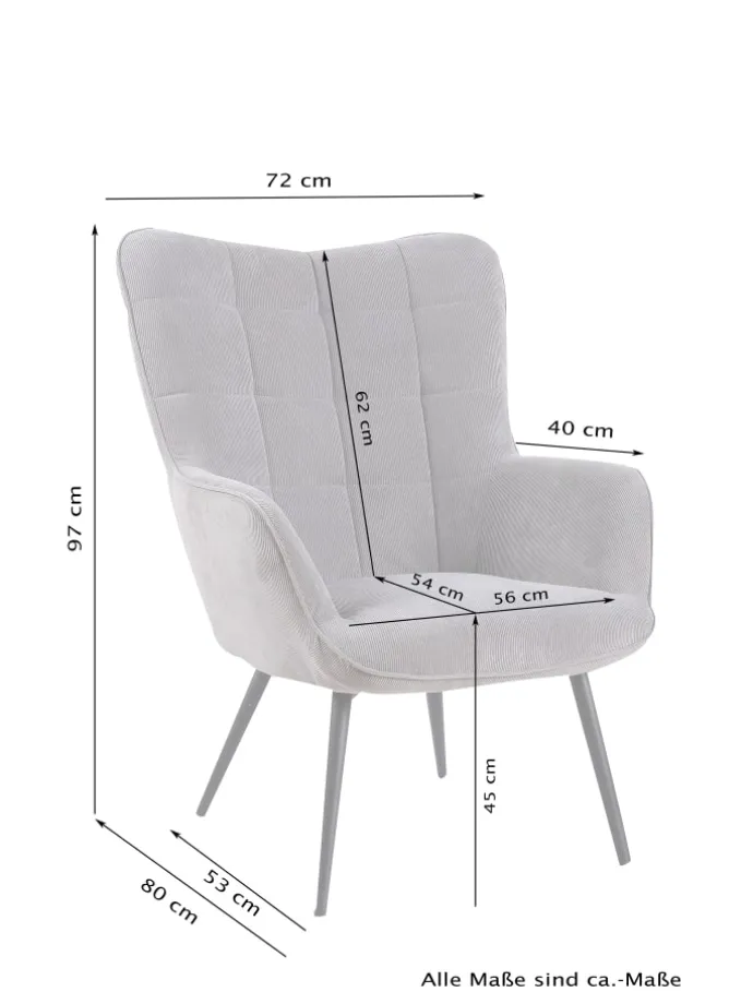 • Besonderheiten: Beinhöhe: vorne 34 cm / hinten 31 cm, Beinabstand: vorne 54 cm / hinten 51 cm / seitlich 52 cm, Armlehnenlänge: 40 cm