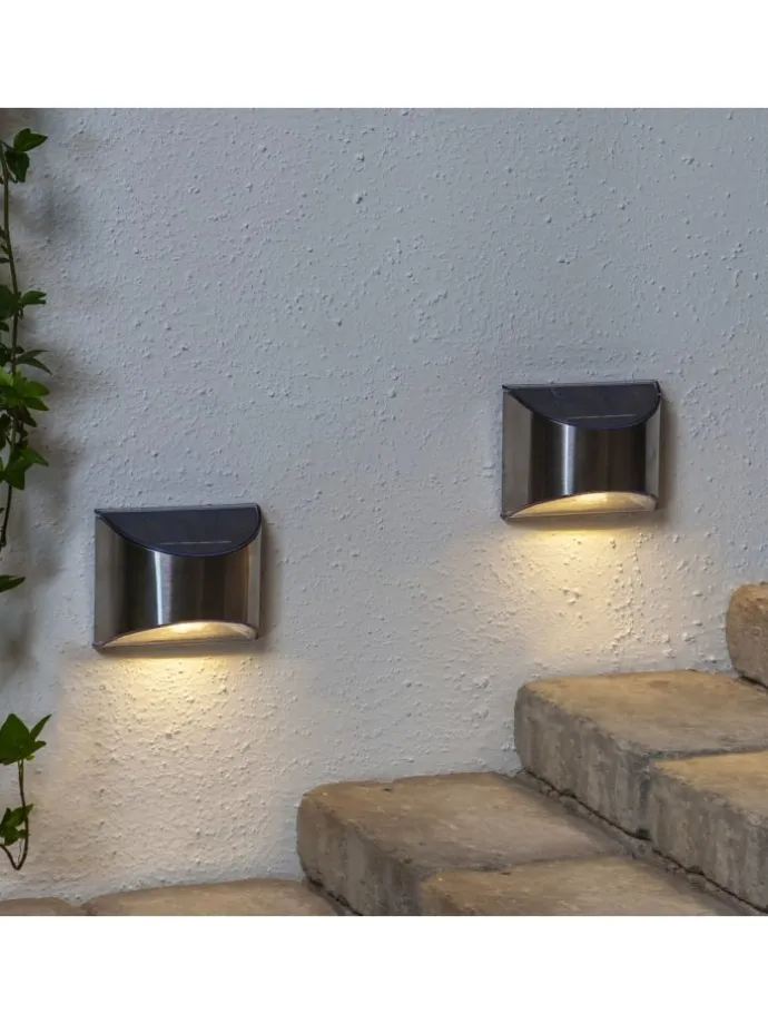 Die 2 LED-Solar-Wandlampen haben eine gebogenen Körper aus Edelstahl und das Leuchtmittel an der abgeschrägten Unterseite