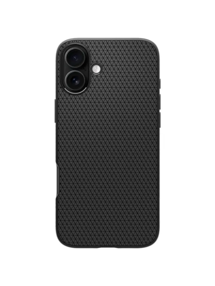 Die Spigen Liquid Air Hülle schützt das iPhone 16 Plus mit stoßabsorbierendem TPU und mattschwarzem, rutschfestem Finish.