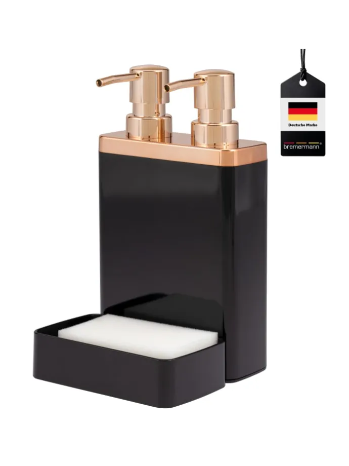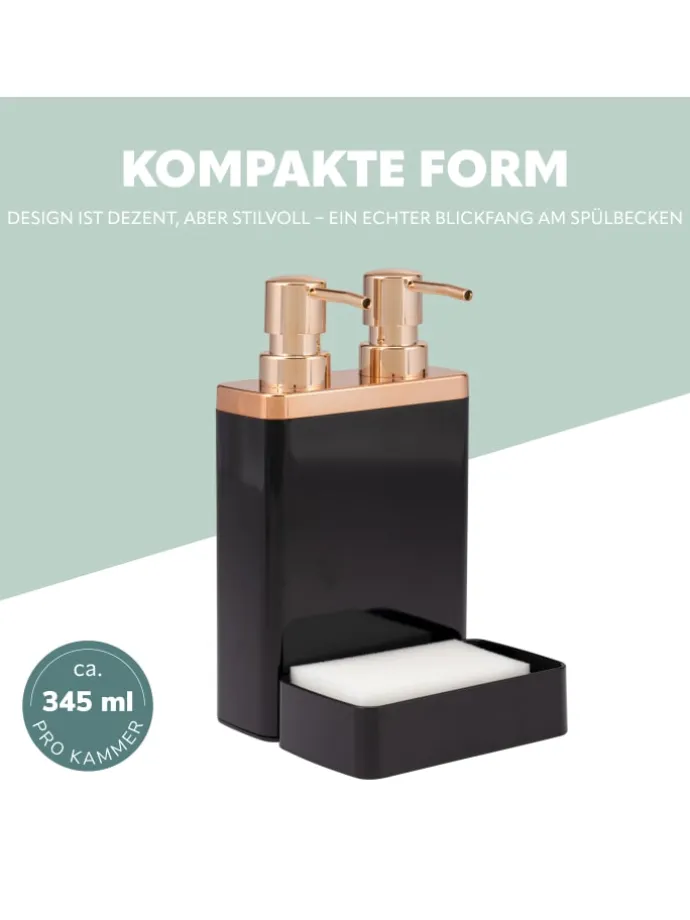Selbige fungiert gleichzeitig als Halterung für den passenden beiliegenden doppelseitigen Schwamm. Das Spülmittel ist in einer Kammer des Spenders stets parat, während Sie auch Handseife oder Desinfektionsgel in die andere Kammer füllen können.