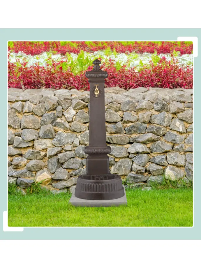 Verleihe Deinem Garten oder Deiner Terrasse nostalgischen Charme mit diesem Standbrunnen im Antik-Design. Egal ob rein dekorativ, zum Hände waschen nach der Gartenarbeit oder um Wasser für das Blumengießen zu zapfen – der Metallbrunnen macht immer eine gute Figur. Der Gartenbrunnen ist mit Wasserhahn und Becken ausgestattet, welches bei Bedarf mit dem beiliegenden Stöpsel verschlossen werden kann. Das Gitter ist ideal zum Abstellen von Gießkannen, Blumentöpfen oder anderen Gegenständen.