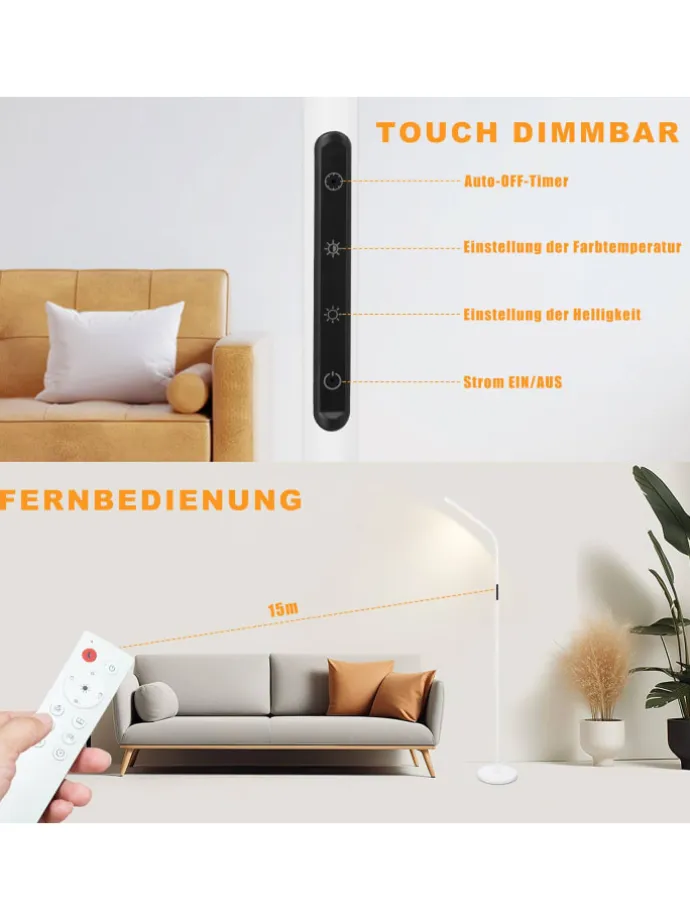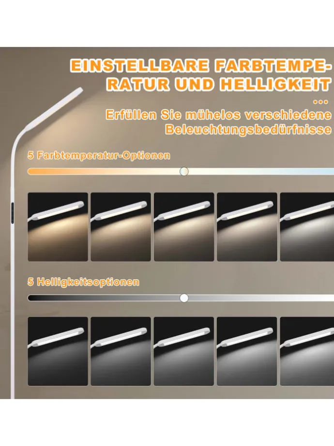 Dimmbar und einstellbare Farbtemperatur: Die LED-Stehleuchte bietet stufenlose Helligkeitseinstellung und Farbtemperaturen von 3000K bis 6500K, um eine warme oder helle Atmosphäre für Lesen, Arbeiten oder Entspannen zu schaffen.