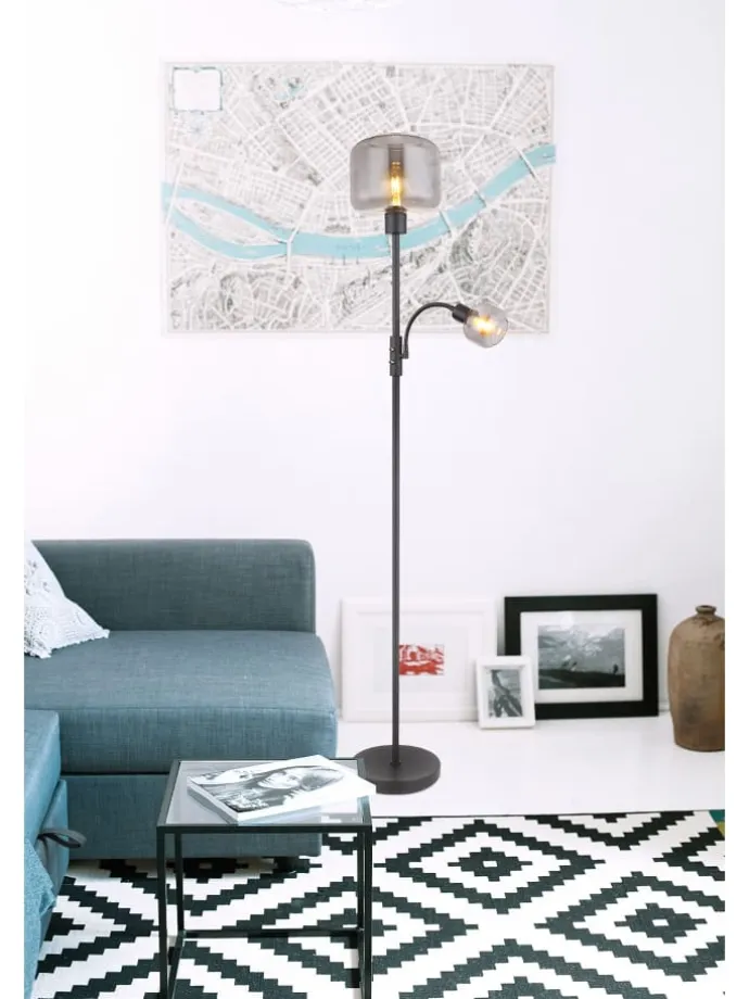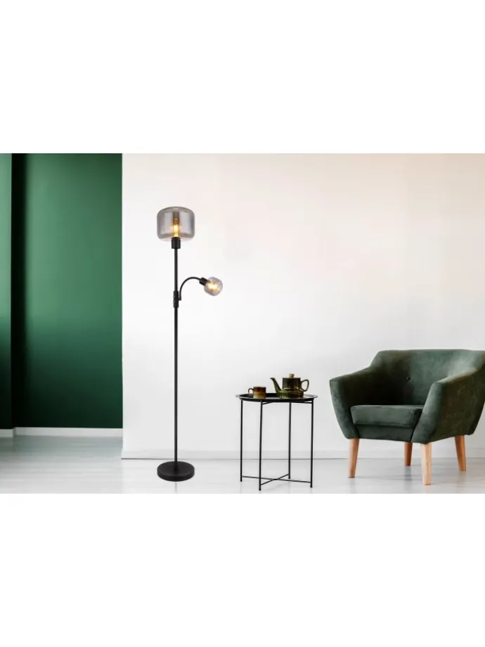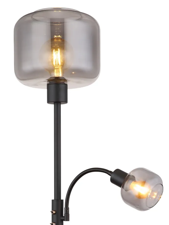 Stehleuchte Metall schwarz matt, Glas rauchfarben, Kippschalter, Flexo, ø: 250mm, H: 1650mm, Kabellänge 1800mm, Leselicht-DM: 100 mm, exkl. 1x E27 40W 230V, exkl. 1x E14 LED 15W 230V
