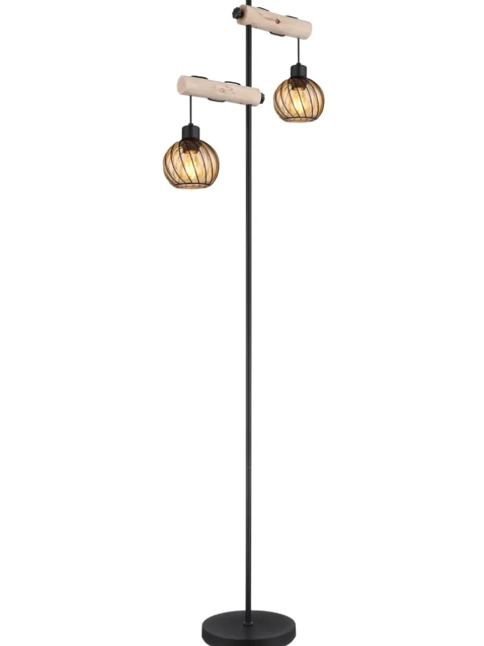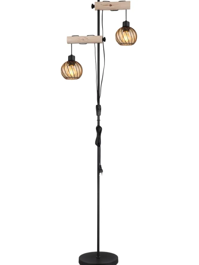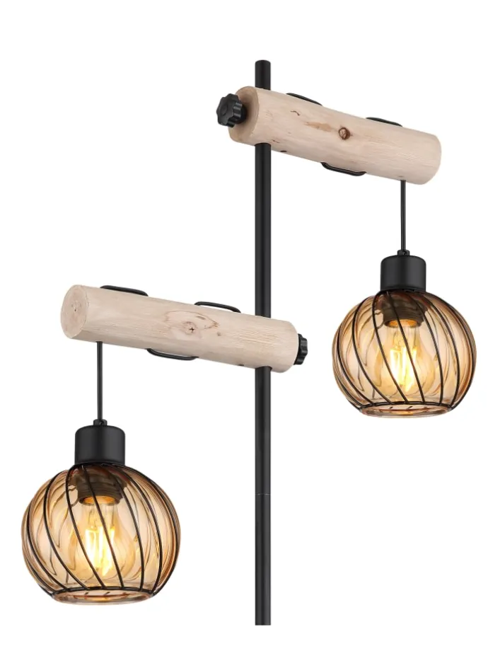 Stehleuchte Metall schwarz matt, Holz naturfarben, Glas amber, Metallstäbe schwarz matt, Kabel PVC Schwarz, Wippschalter am Kabel, Höhenverstellbar, 2 Schalter, LxBxH: 480x250x1680mm, Kabellänge 1800mm, exkl. 2x E27 15W 230V