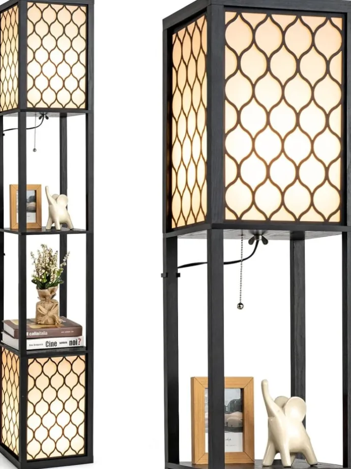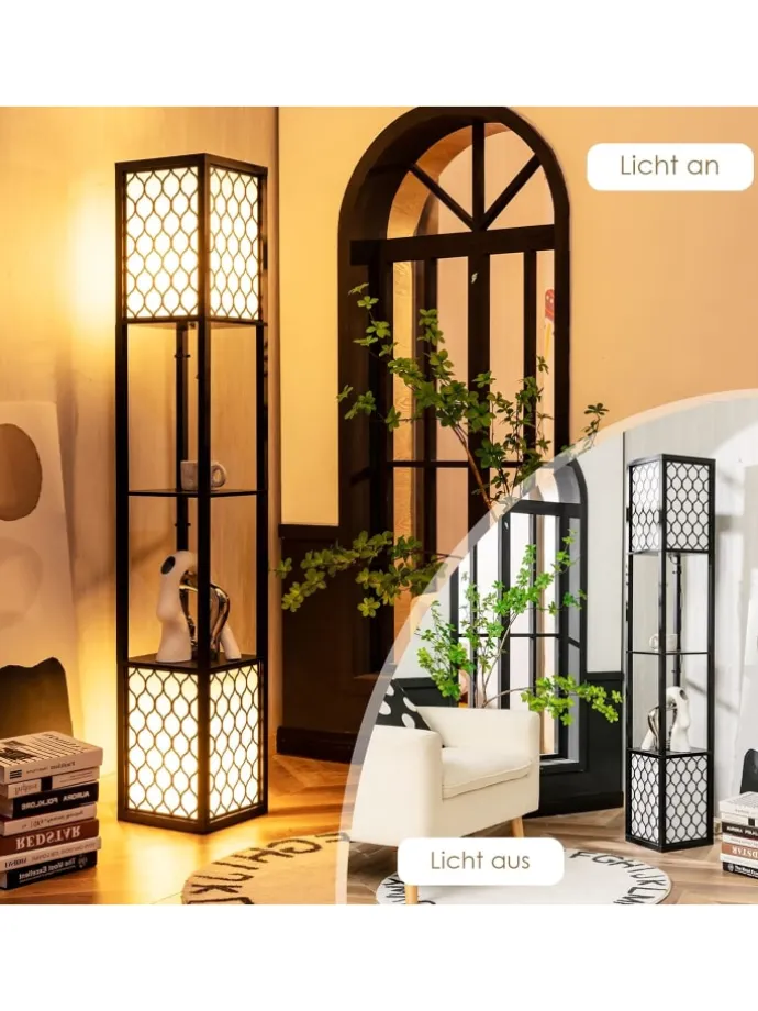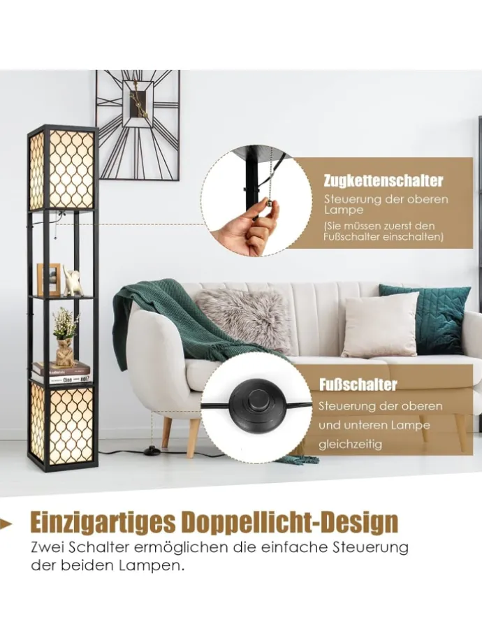 Unsere Bodenlampe ist nicht nur eine Lichtquelle, sondern auch ein funktionales Möbelstück, das für Ordnung sorgt. Die Kombination aus zwei Glühbirnen oben und unten schafft eine entspannende und komfortable Atmosphäre. Der hochwertige Lampenschirm erzeugt ein weiches und gemütliches Licht. Mit dem Fußschalter und der Kette zum Ziehen ist die Bedienung sehr einfach. Sie können beide Glühbirnen oder nur die untere Birne nach Belieben einschalten. Die Lampe ist aus hochwertigem Holz gefertigt und somit sehr langlebig. Zudem können persönliche Gegenstände auf den Regalen leicht griffbereit verstaut werden. Wenn Sie nach einer multifunktionalen und stilvollen Lampe suchen, ist unsere Lampe die perfekte Wahl.
