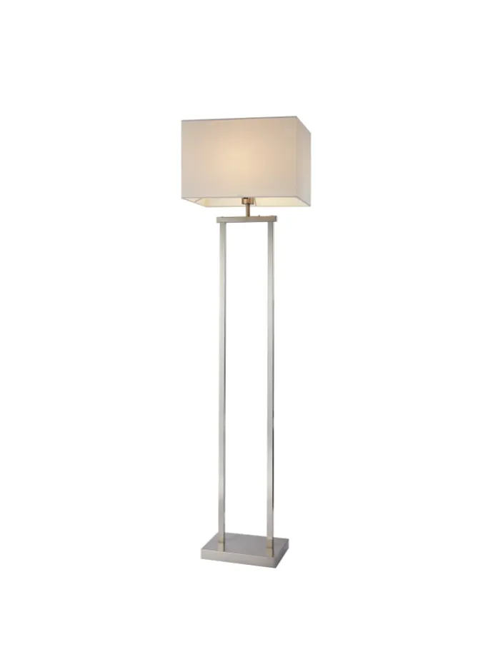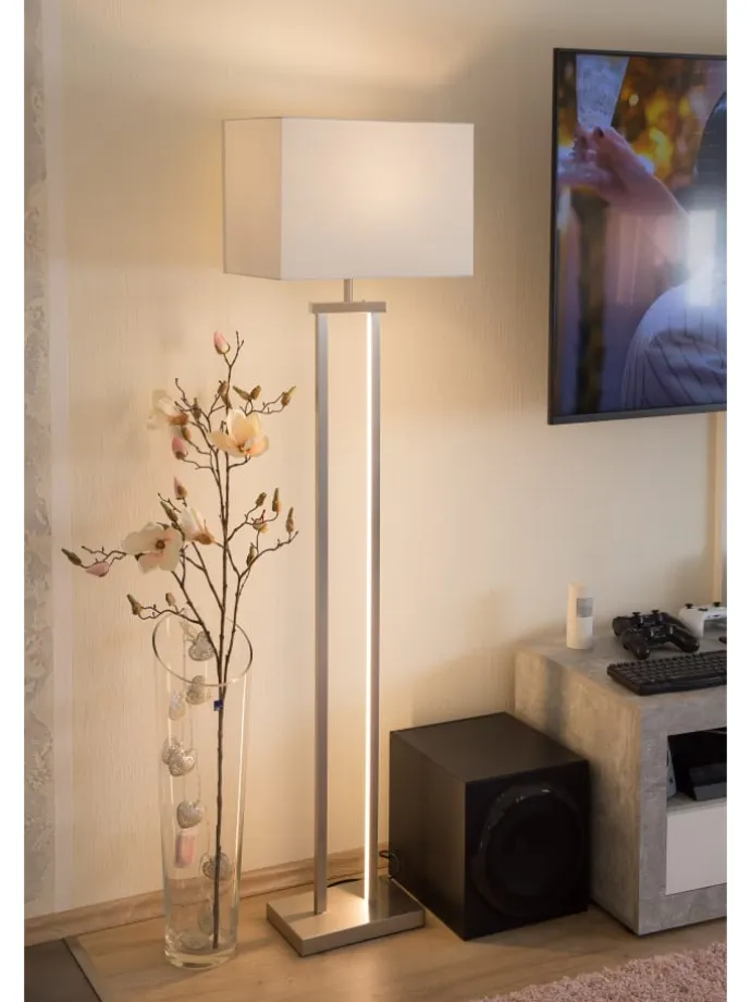 Stehleuchte Metall Nickel matt, Textil beige, Druckschalter, dimmbar, Dimmer, Getrennt schalt- bzw. dimmbar, LxBxH: 400x270x1500mm, inkl. 1x E27 LED 8W, 806lm Output, 2700K, inkl. 2x LED 12.5W, 1450lm Output, 3000K