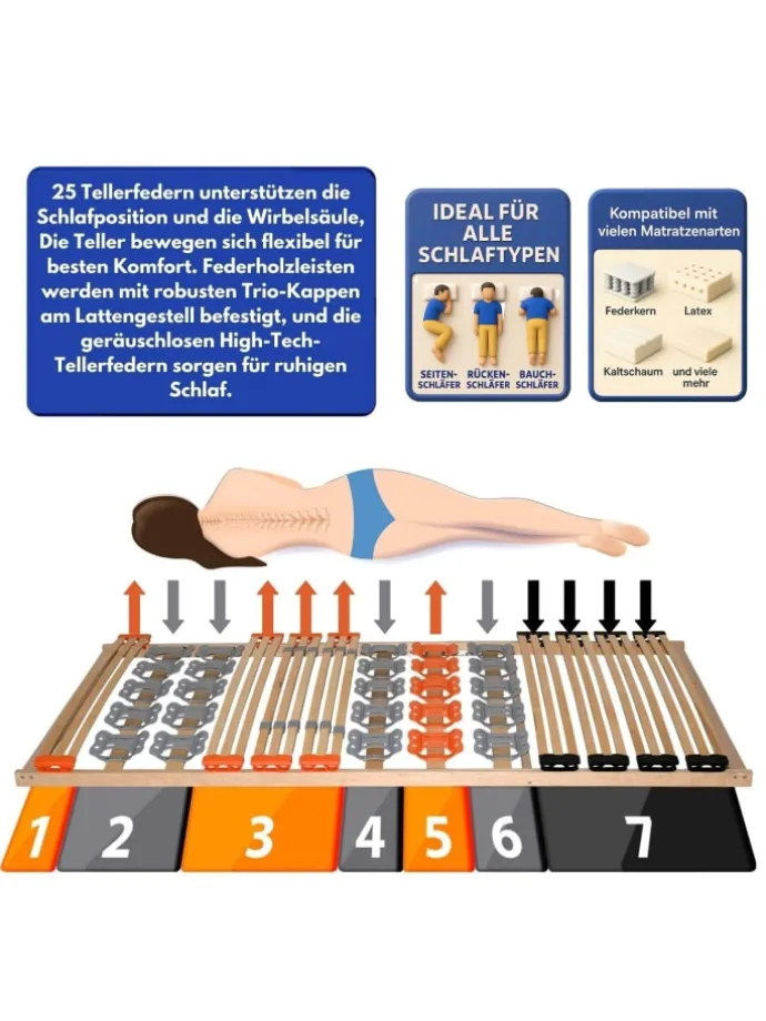Ein erholsamer Schlaf ist der Schlüssel zu einem produktiven Tag, und unser kombinierter Federleisten-Tellerlattenrost ist der perfekte Begleiter für Ihren Schlaf. Die besondere Tellerbauweise ermöglicht eine optimale Luftzirkulation unter Ihrer Matratze und hilft, Feuchtigkeit und Hitze abzuleiten, sodass Sie immer in angenehmer Temperatur schlafen können. Keine unruhigen Nächte mehr aufgrund von übermäßigem Schwitzen.