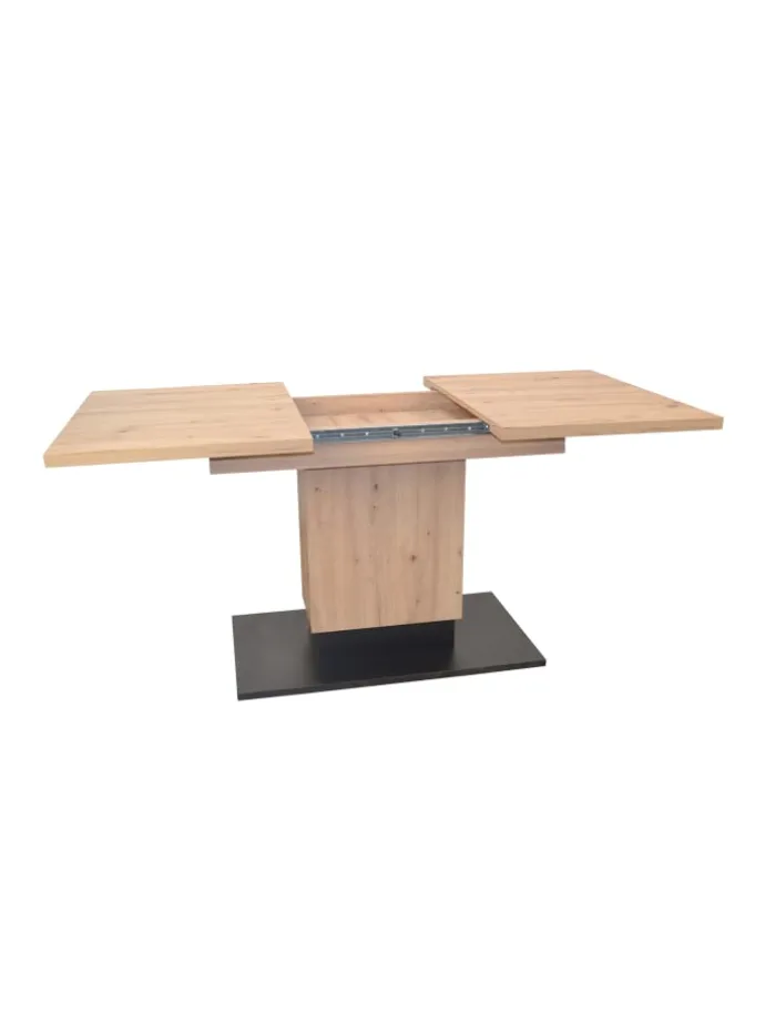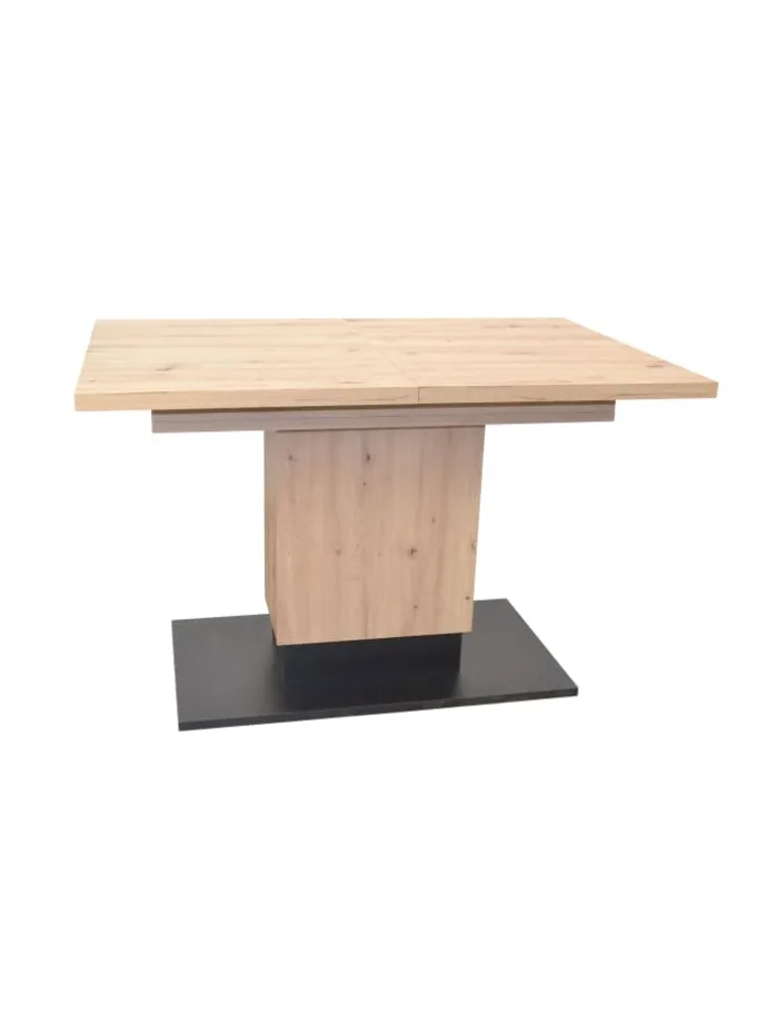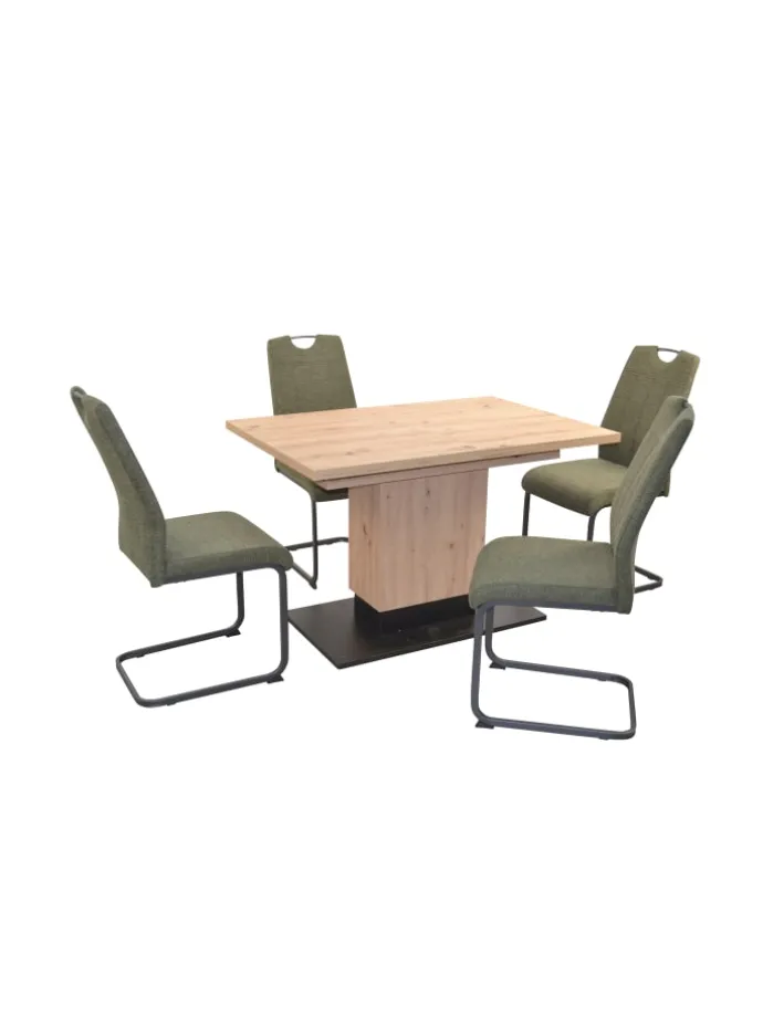 Moderne 5tlg. Sitzgruppe bestehend aus einem Säulen-Esstisch mit Auszugsfunktion und 4 hochwertigen Schwingstühlen. Der moderner Esstisch ist komplett aus Holzwerkstoff gefertigt und mit einem pflegeleichten Melamin-Holzdekor, Artisan-Eiche-Nachbildung, beschichtet. Stabiles Säulengestell, Bodenplatte uni schwarz. Die Tischplatte ist in der Mitte geteilt und lässt sich schnell und einfach dank der zwei Metall-Synchronauszügen auseinander ziehen. Darunter befinden sich zwei eingelegte Erweiterungsplatten (je ca. 30 cm breit), dadurch lässt sich die Tischplatte von 120 cm bis auf 180 cm vergrößern. Die 4 Stühle haben ein schwarzes Stahlrohrgestell, Sitz und Rücken sind bequem schaumstoffgepolstert und mit einem attraktiven Stoffbezug (100% Polyester), wahlweise in grau, grün oder bordeauxfarben bezogen. Esstisch und Stühle werden zur Selbstmonage, inklusive Aufbauanleitung angeliefert. Maße ca. cm: Esstisch (B/H/T) 120-180/76/80 // Stühle (B/H/T) 44/99/61. Sitzöhe ca. 47 cm. Sitztiefe ca. 43 cm