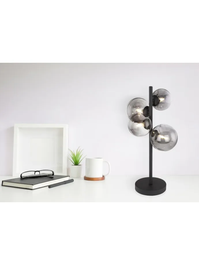 Tischleuchte Metall schwarz matt, Glas rauchfarben, Wippschalter am Kabel, LxBxH: 270x230x510mm, Kabellänge 1500mm, Glas-DM: 2x12cm, 2x10cm, inkl. 4x G9 LED 3.5W 230V, 350lm Source, 130lm Output, 3000K
