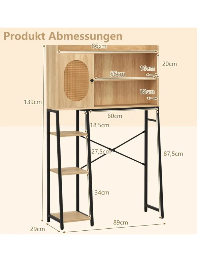 Dieses über der Toilette platzierte Regal bietet zusätzlichen Stauraum, ohne zu viel Bodenfläche zu beanspruchen. 1 Ablagefläche oben, 1 Schrank mit aktivem Regal, 2 Fächer und 3 offene Regale halten Ihre Badezimmerartikel gut organisiert. Das aktive Regal können Sie anpassen, um verschiedene Artikelgrößen zu verstauen. Darüber hinaus verleihen die natürliche Falsch-Holzmaserung und die PE-Rattan-Tür dem Wäscheraum und Balkon einen charmanten Akzent.