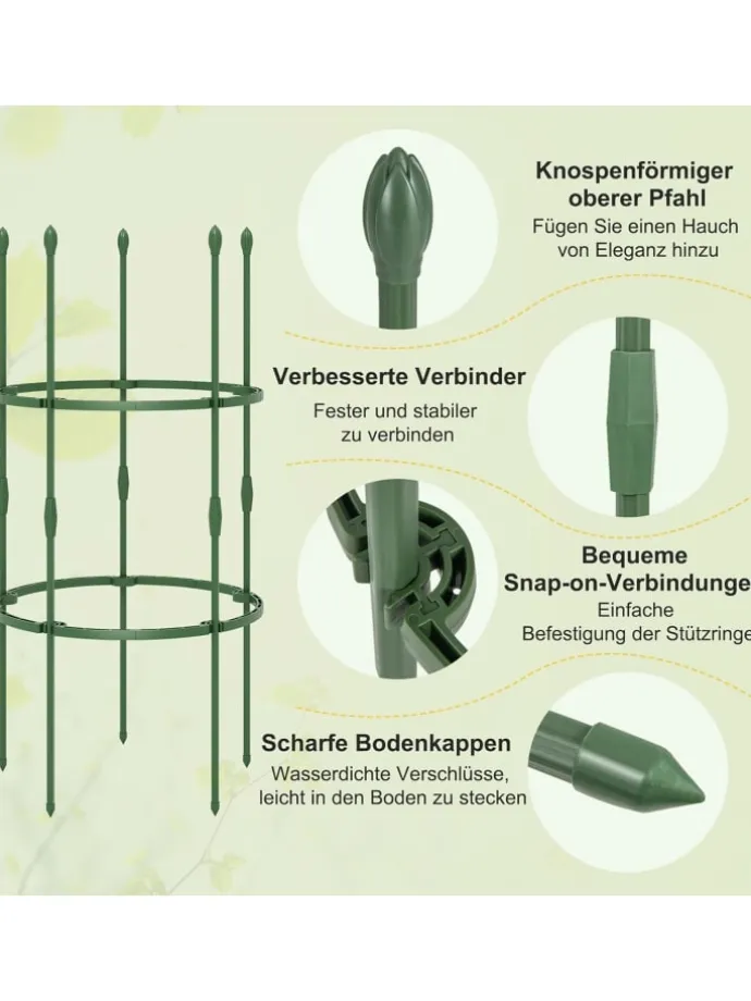 Fördern Sie das Wachstum Ihrer Kletterpflanzen! Das Rankgitter kann in verschiedene Höhen eingestellt werden, sodass Sie den Wachstumsbedürfnissen verschiedener Kletterpflanzen gerecht werden können. Darüber hinaus sind unsere rostfreien PE-beschichteten Metallstangen im Gegensatz zu normalen Metallstangen, die Pflanzen leicht verbrennen würden, sicher in der Nähe Ihrer Pflanzen zu verwenden und minimieren das Risiko von Pflanzenschäden.
