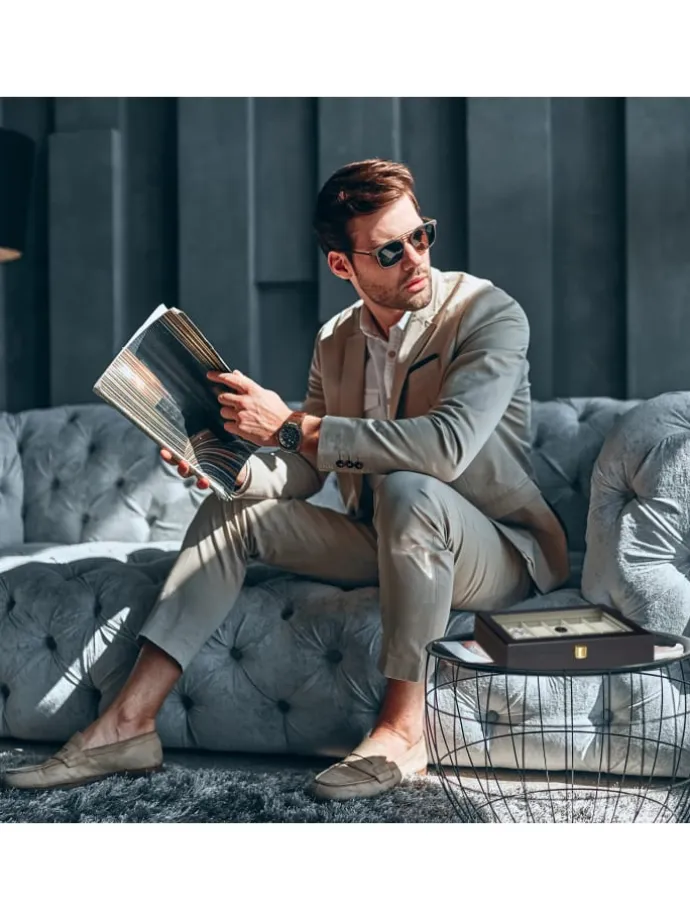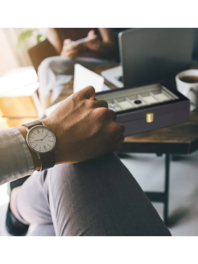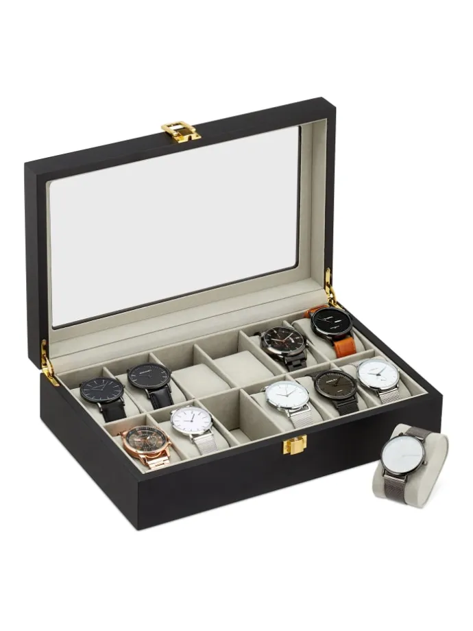 Als stilsicherer Mann wissen Sie: Zu unterschiedlichen Anlässen benötigen Sie verschiedene Uhren. Mit dieser Uhrenschachtel bewahren Sie Ihre kostbaren Uhren sicher und staubgeschützt auf. Die weichen Uhrenkissen mit Samtbezug schützen Ihre Uhren zudem vor unschönen Kratzern und Beschädigungen. Dank des Glas-Sichtfensters der Uhrentruhe haben Sie all Ihre Uhren immer im Blick. Auf diese Weise ist die passende Armbanduhr für Ihr Outfit schnell ausgewählt – ohne lästiges Suchen.