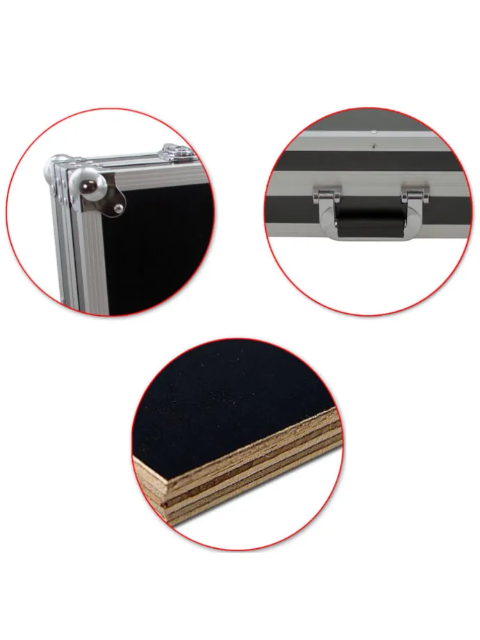 SOLIDE:Der Transportkoffer aus schwarz beschichtetem Holz schützt zuverlässig beim Transport oder Lagerung. Das stabile Flightcase ist aus 7mm Birkenmultiplex gefertigt, mit Alukanten versehen und hat 8 Kugelecken aus Stahl.